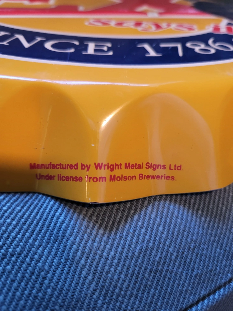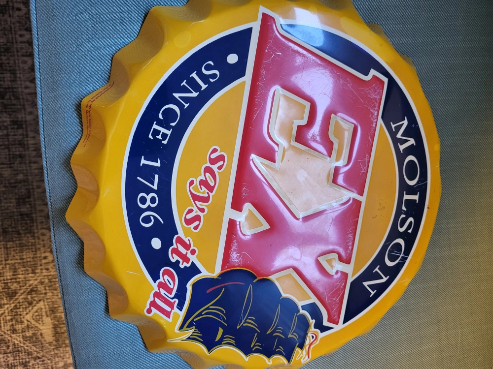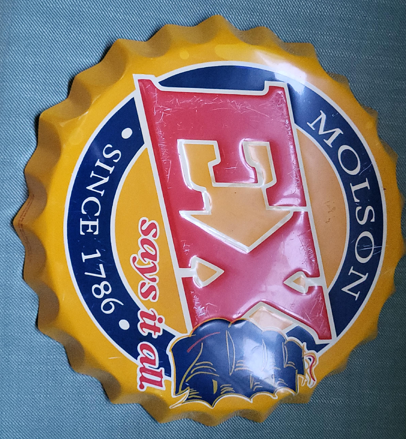 Selling a Molson Export bottle cap sign. It's manufactured by Wright Metal Signs Ltd under license from Molson Breweries. Great for a bar or rec room!