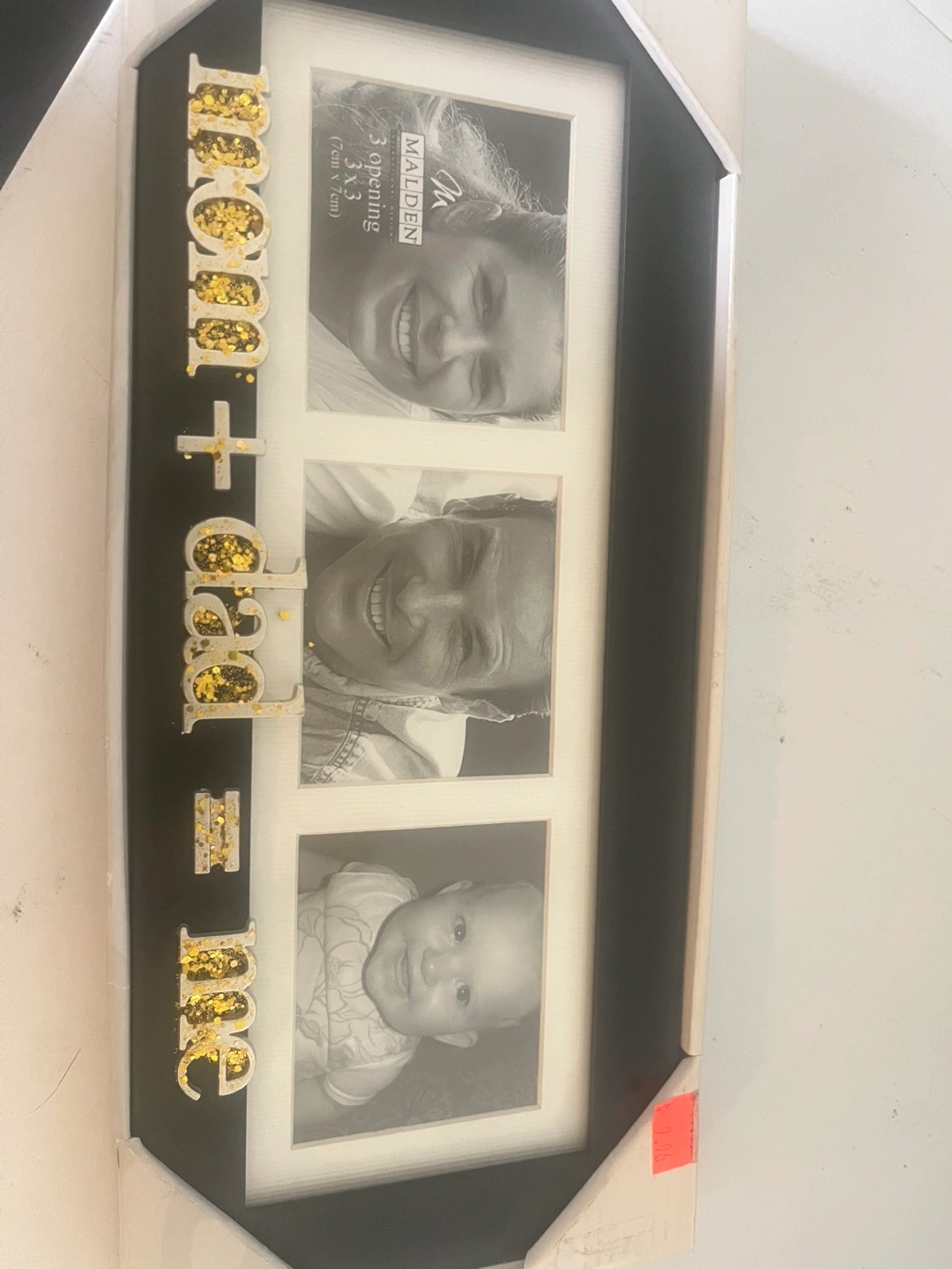 269Black frame with three 3x3 inch openings. Gold glitter lettering reads Mom + Dad = Me. Perfect for family photos.