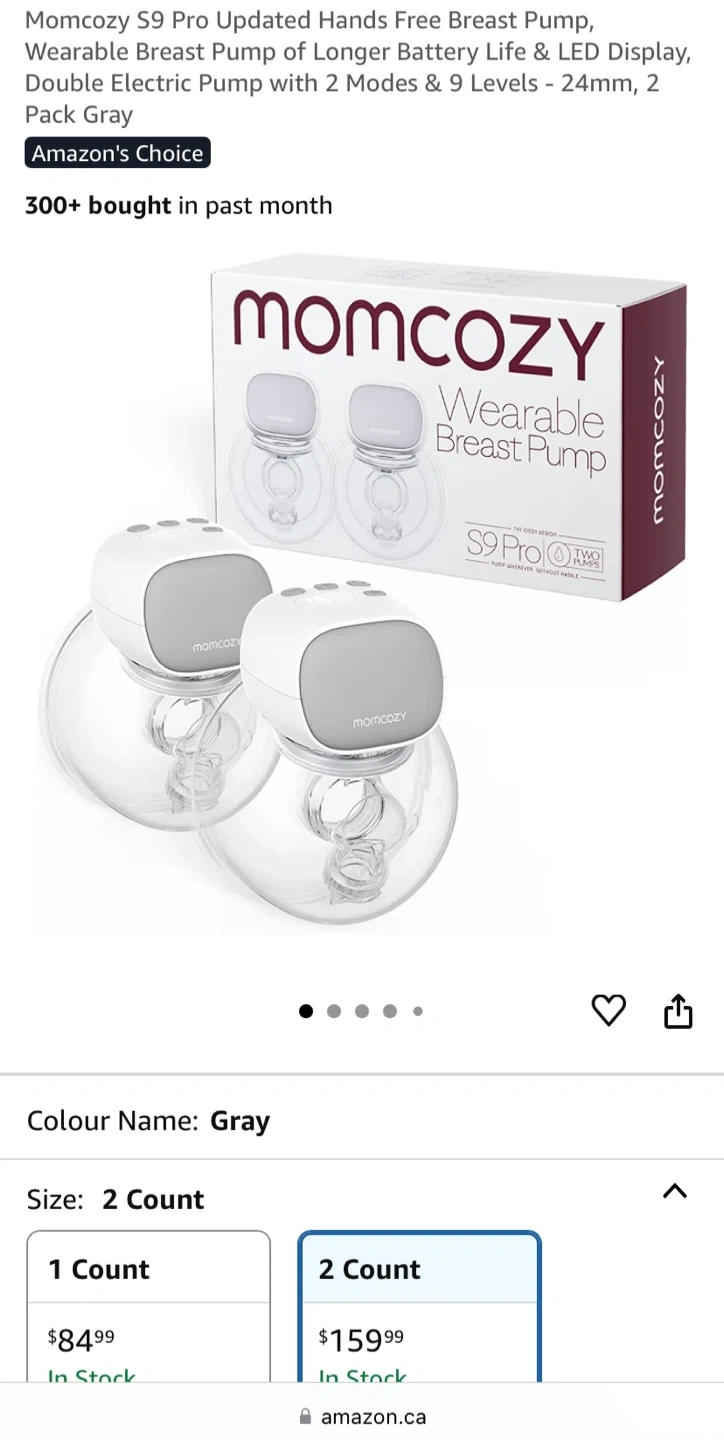 17Selling a Momcozy S9 Pro Wearable Breast Pump in gray. It's a double electric pump with 2 modes and 9 levels, 24mm. It comes with 2 pumps. One is brand new and the other is light use