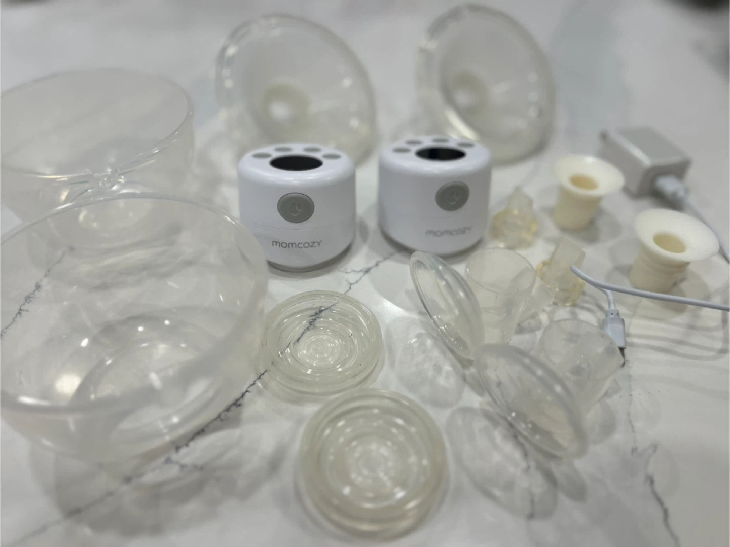 65Selling a Momcozy wearable breast pump set! It comes with all the parts you see in the photos, including the charger. It features a smart display screen with different modes like suction and massage, and level display. It also has an anti-leak design with anti-overflow and anti-backflow features. Quiet, won't wake the sleeping baby!