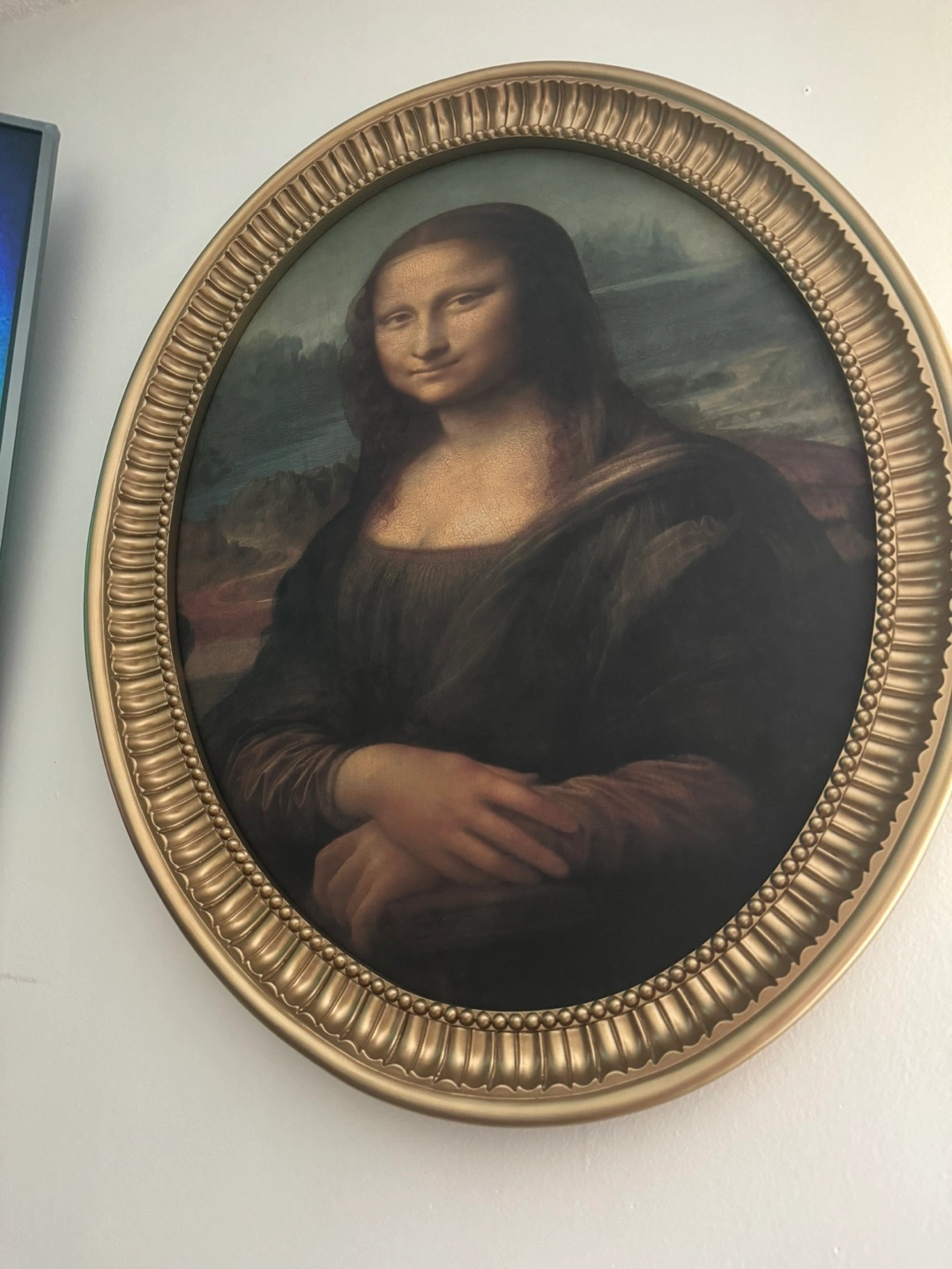 10Oval framed print of Mona Lisa. Gold frame.