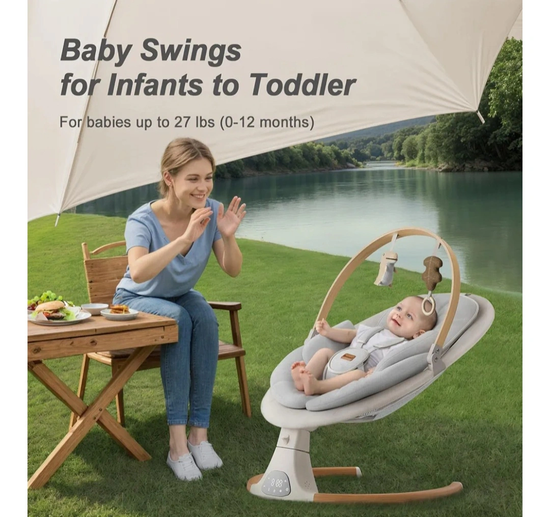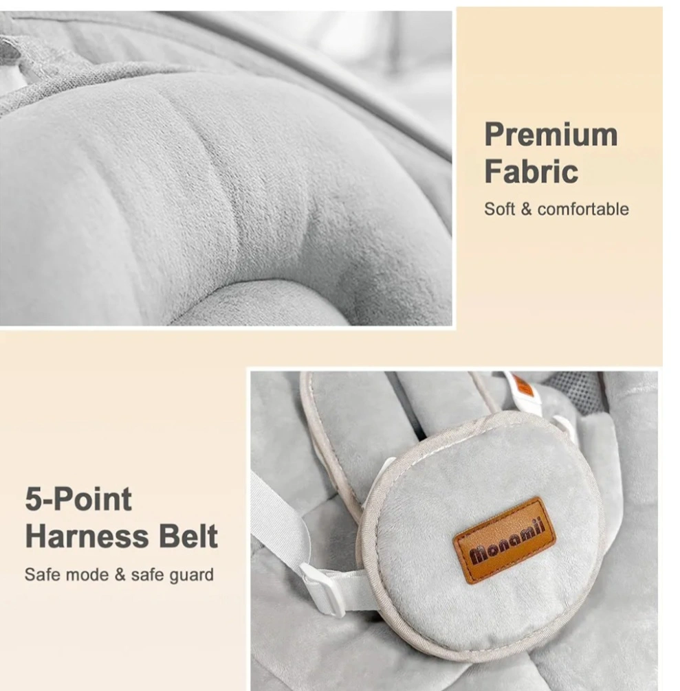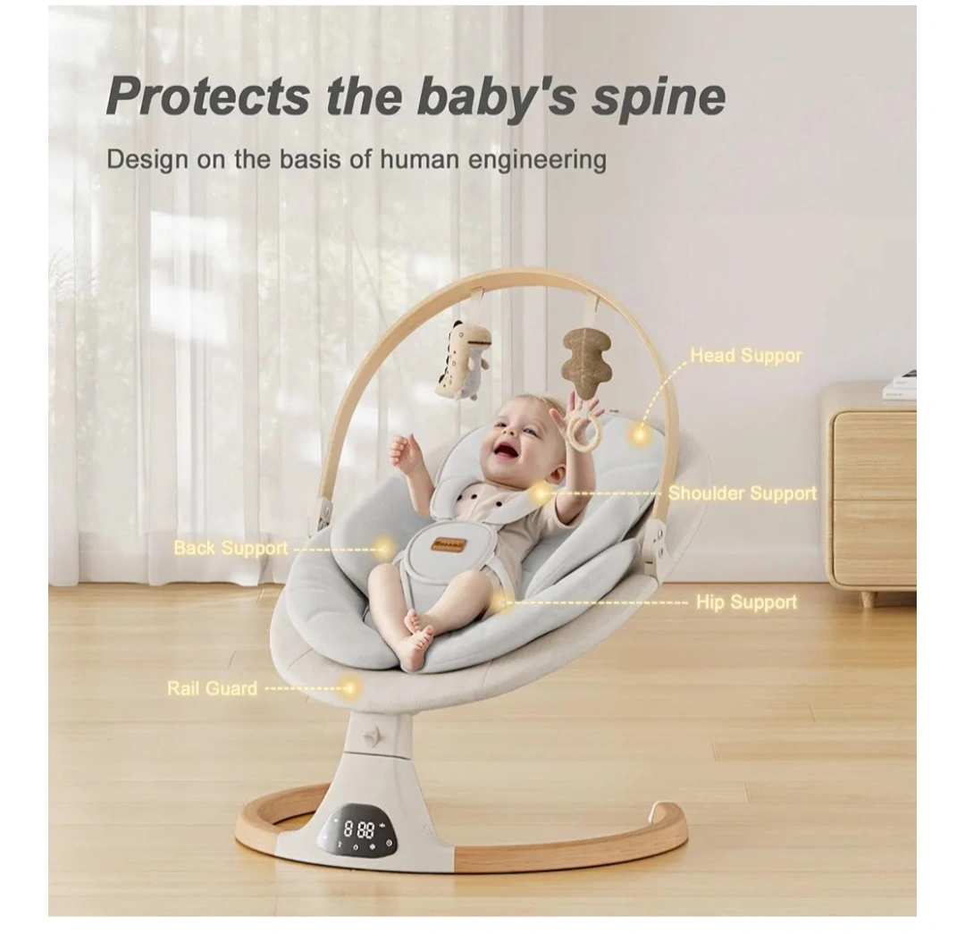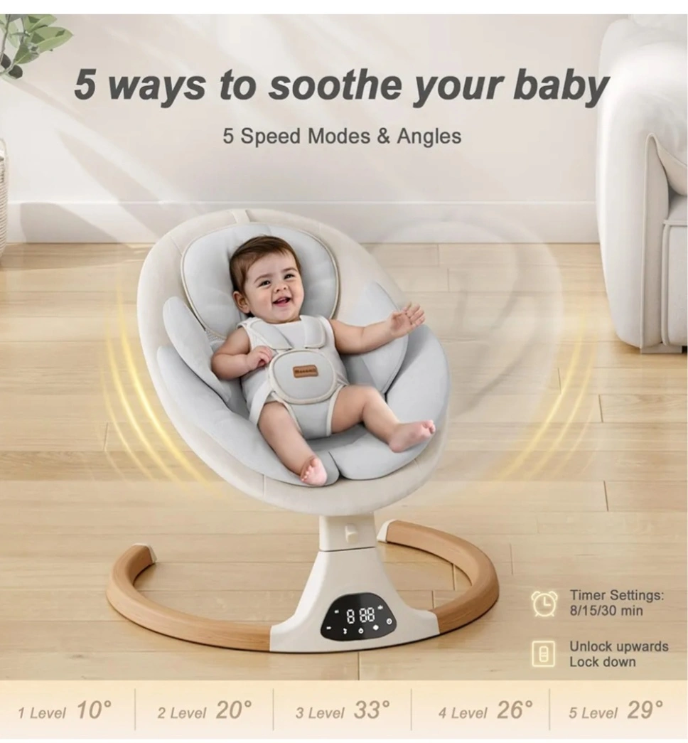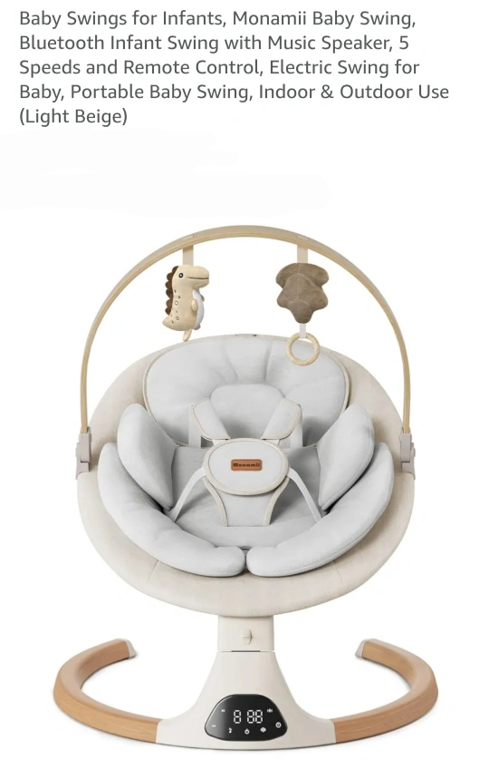 111This Monamii baby swing is perfect for infants! It features: - Bluetooth connectivity - 5 speed modes - Remote control - Music speaker - Light beige color It's suitable for both indoor and outdoor use and can soothe your baby with its various speed modes and angles. It's designed to protect the baby's spine and is made with premium, soft, and comfortable fabric