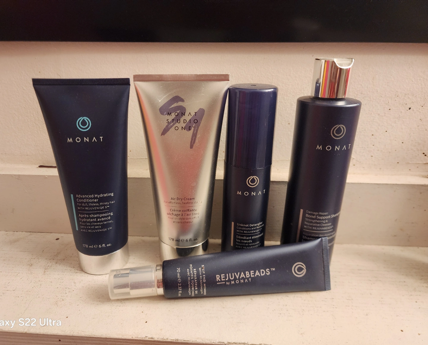 Assortment of MONAT hair products. Includes shampoo, conditioner, detangler, and styling cream. Perfect for revitalizing and repairing hair.