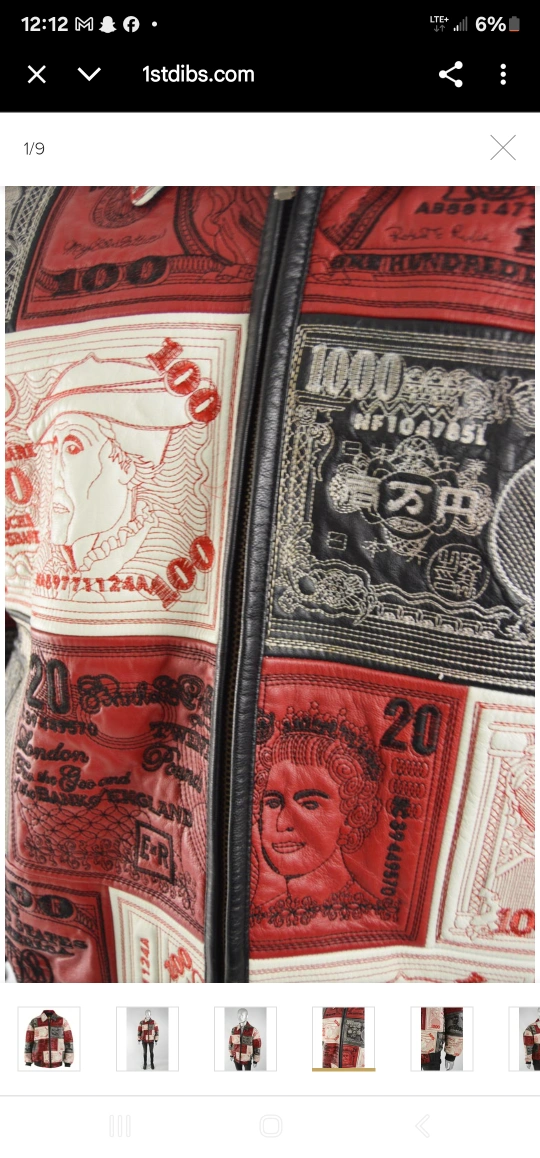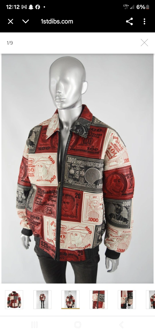 Check out this unique leather bomber jacket with a money print design! It's a statement piece that's sure to turn heads. The jacket features various currency designs in red, white, and black. Perfect for adding a bold touch to your wardrobe!