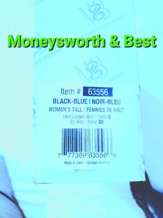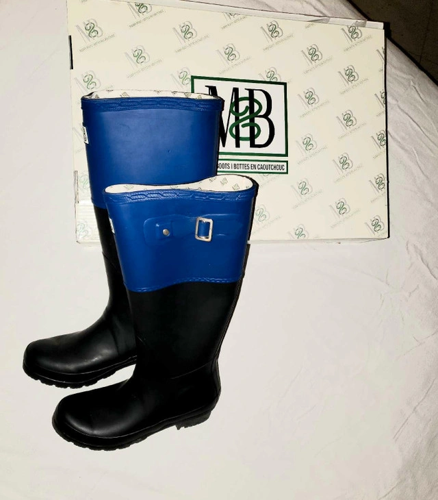 Women's tall rain boots. Black and blue. Size 6. Waterproof rubber. Buckle strap. Excellent condition.