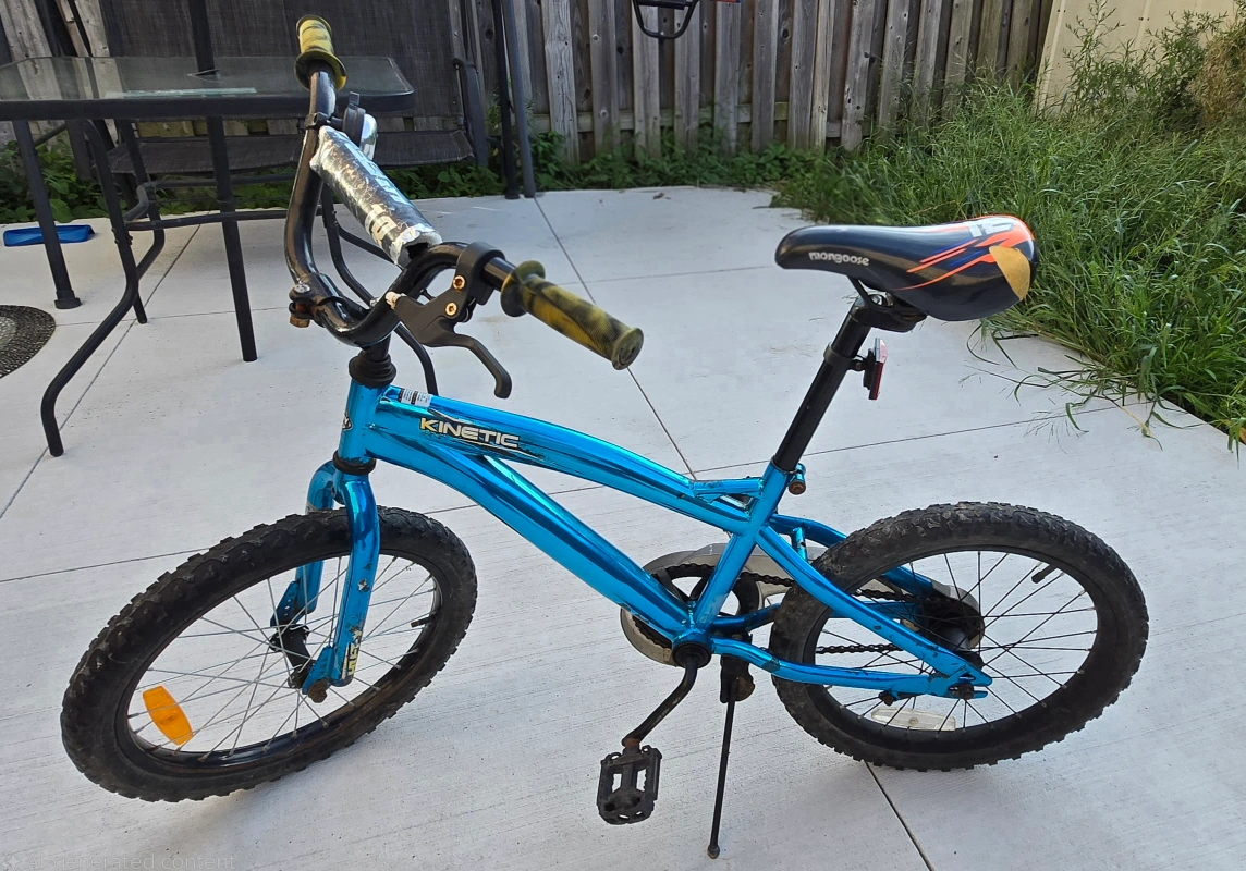 Selling a Mongoose Kinetic kids bike with 16-inch wheels. The bike has a blue frame and a Mongoose branded seat. It's in used condition, so please check the photos for details!