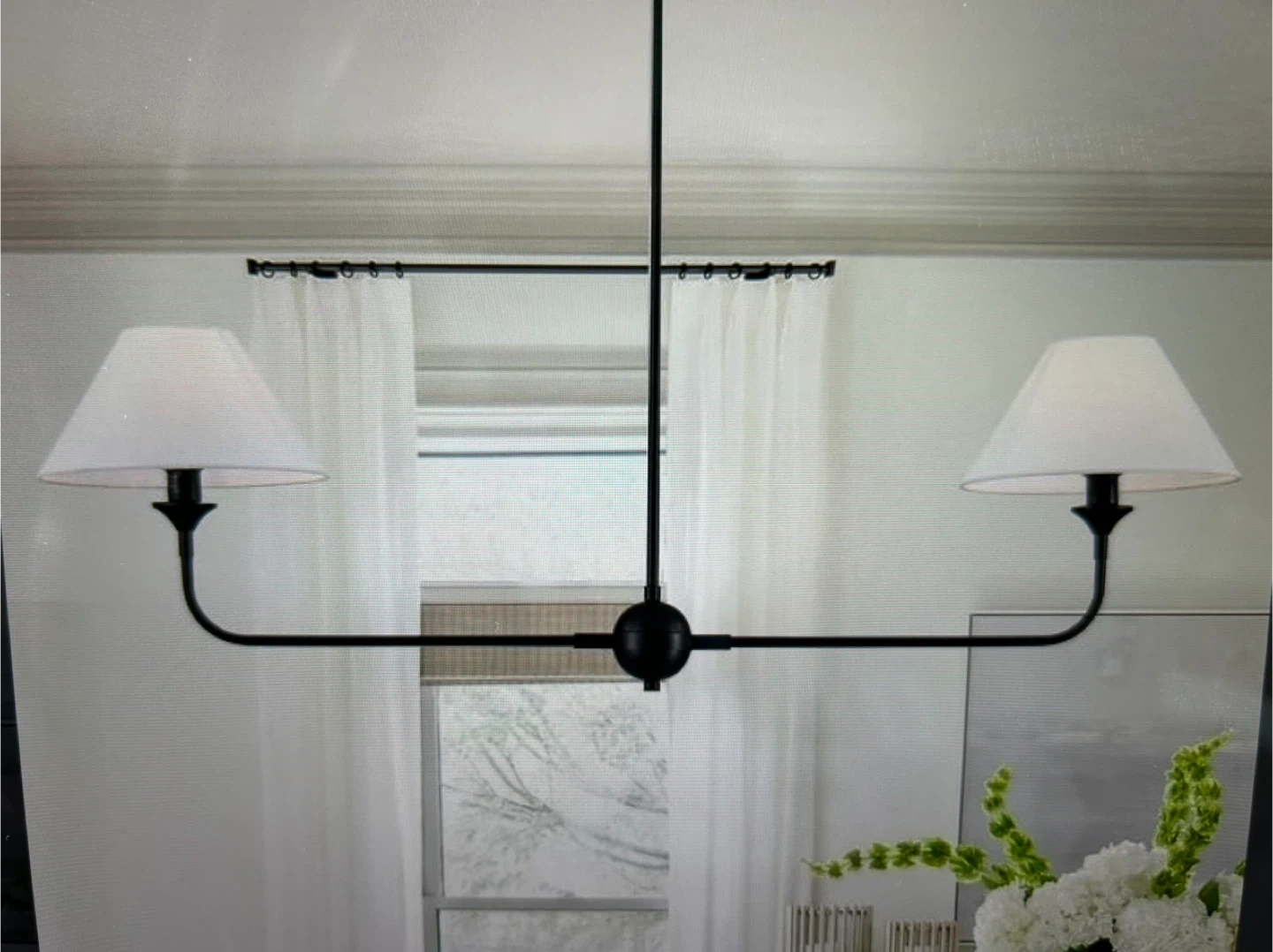 This black chandelier features two white fabric lampshades that diffuse light softly. It's designed with an E12 bulb base. The fixture comes with an instruction manual for assembly.