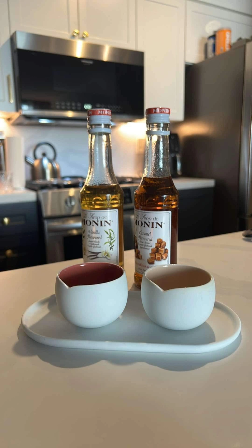 Two Monin Syrup Bottles - Caramel and Vanilla Flavoured opened but not used. 2 Origin Nespresso cups with their plate for cookies or chocolate. Original price $75