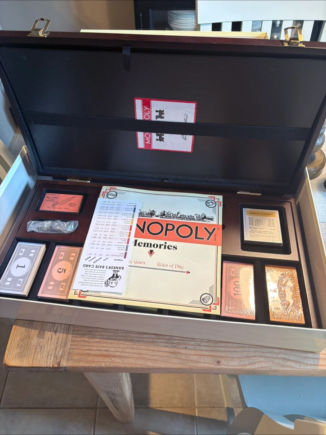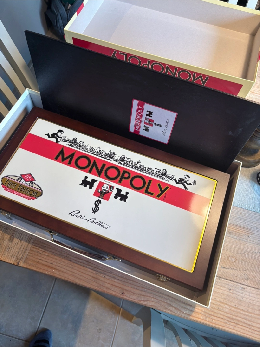 Selling a Monopoly Deluxe First Edition Classic Reproduction board game from Restoration Hardware. It is in great condition and comes with all the pieces and the original box. This is a beautiful set for any Monopoly enthusiast!