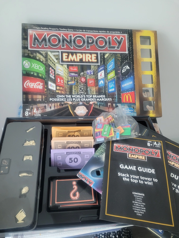 Monopoly board game, includes game board, game pieces, cards, dice, and money.