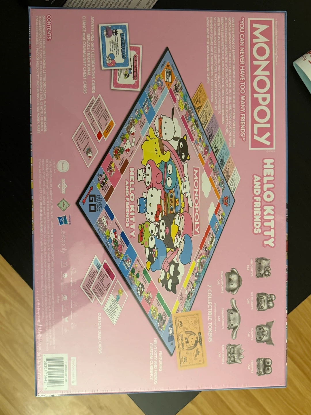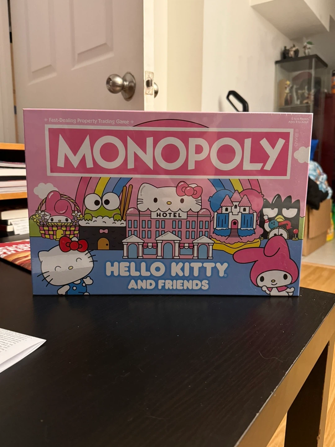 Selling a Monopoly Hello Kitty and Friends edition board game! It's a fast-dealing property trading game featuring Hello Kitty and her friends. Includes custom Hello Kitty themed cards and currency, and 7 collectible tokens to choose from. Perfect for family game night or a gift for a Hello Kitty fan!