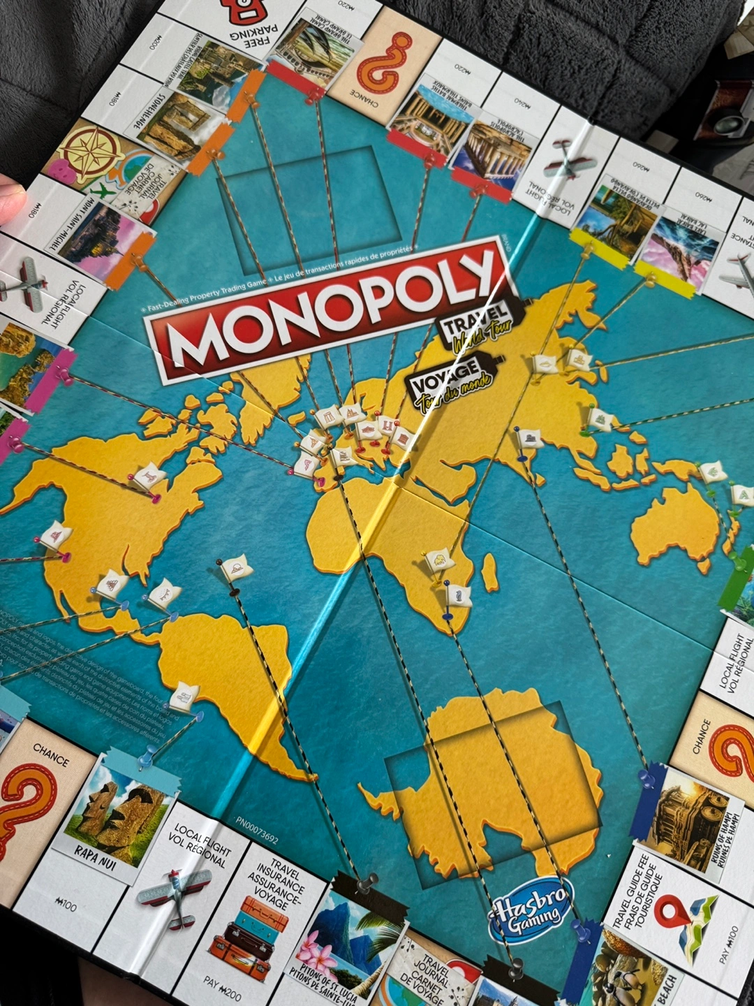 15Monopoly Travel World Tour board game. Includes game board, tokens, money, cards, and dice. Suitable for ages 8+. Fun for the whole family!