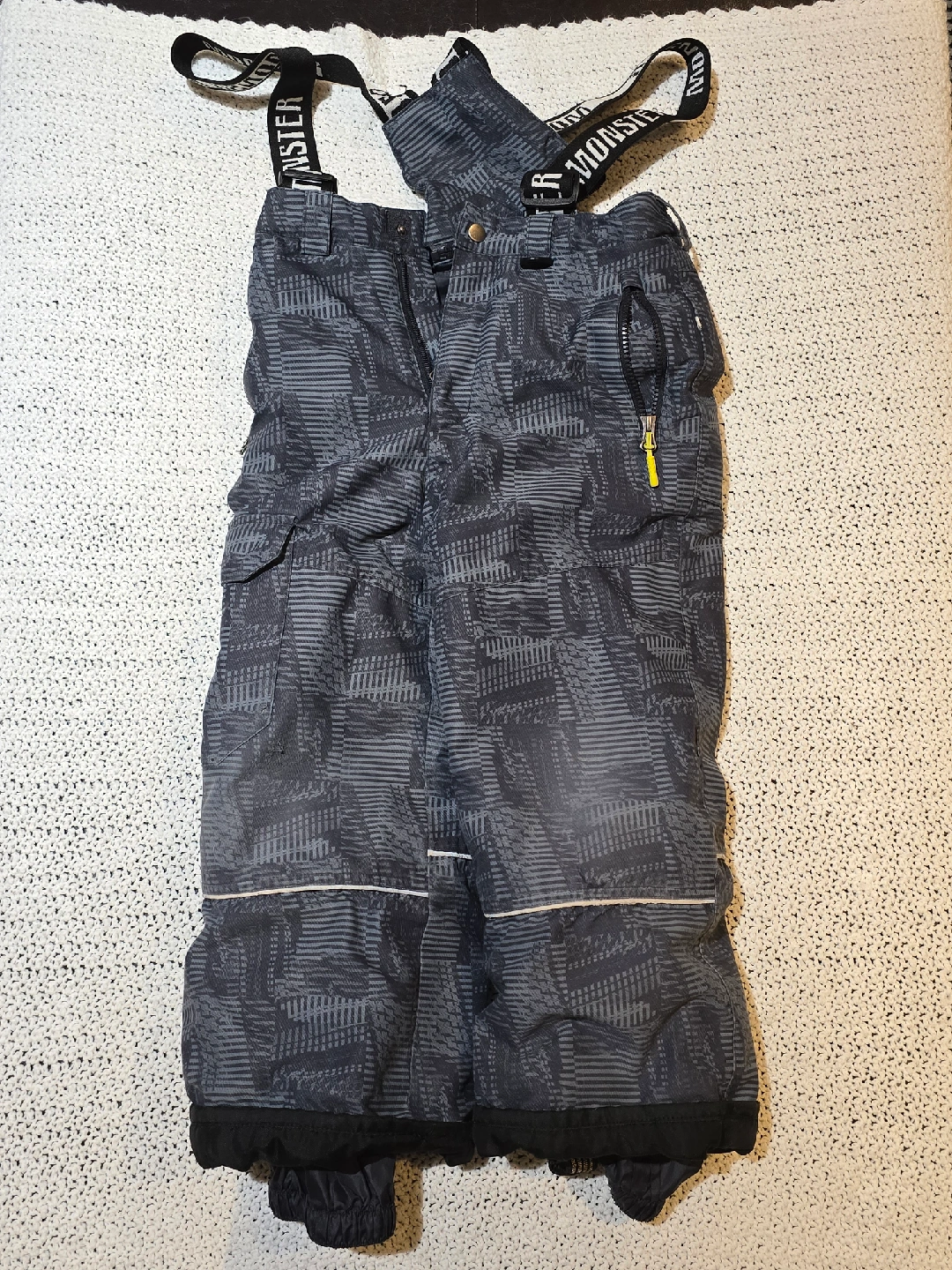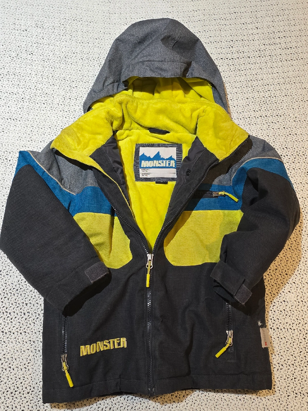 20Selling a kids' snowsuit set from Monster! This set includes a jacket and snow pants, perfect for keeping your little one warm and dry during winter activities. The jacket features a hood and a vibrant yellow lining, while the pants have adjustable suspenders. Both pieces are in great condition and ready for some snowy adventures
