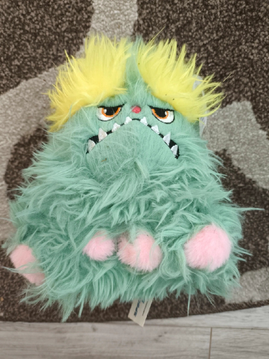 Selling a cute monster plush toy! It's green and fluffy with yellow hair and pink toes. Perfect for kids or collectors!