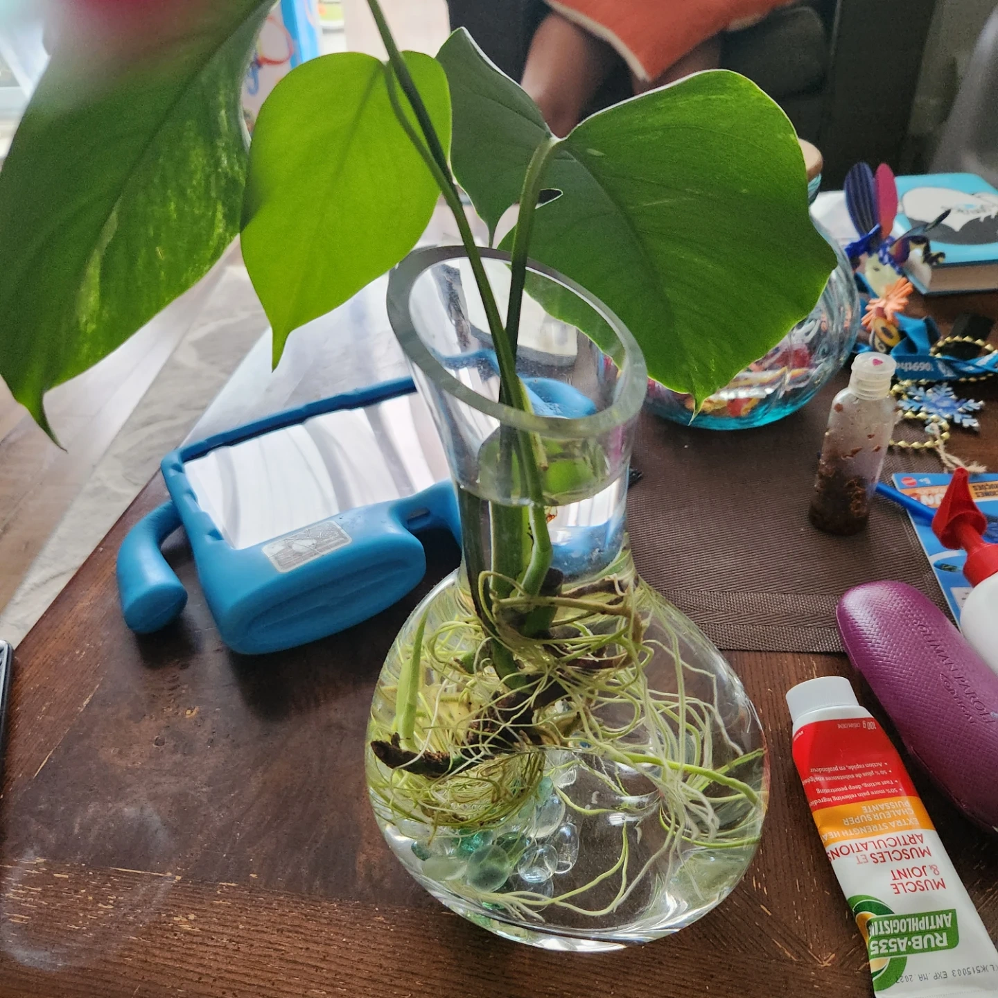 10I have a monstera plant cutting in a glass vase. The plant is healthy and has well-developed roots. Perfect for adding some greenery to your home!