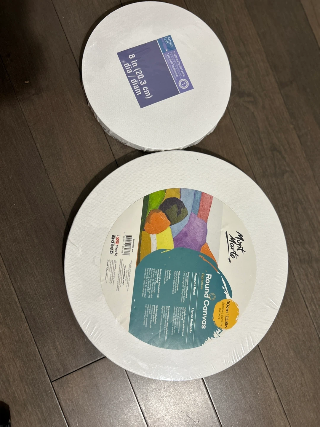 Both for $10. Selling a set of Mont Marte round canvases! There's one that's 8 inches in diameter, and another that's 12 inches. Great for painting and other art projects