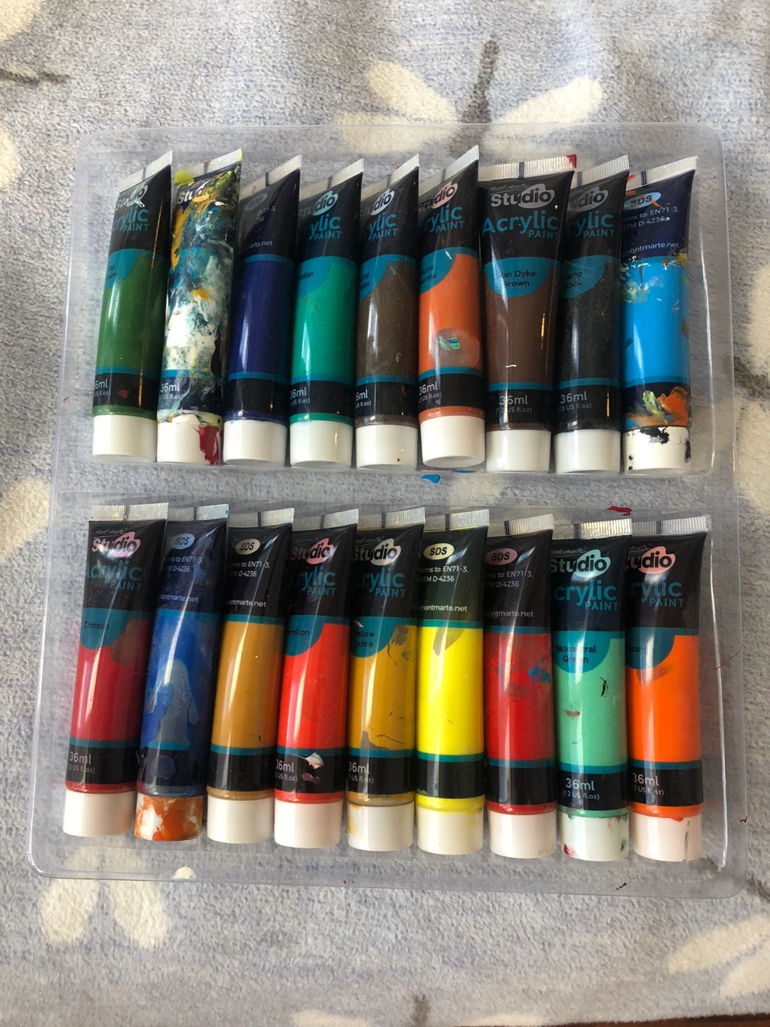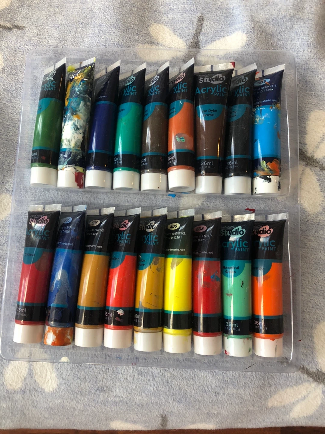 419Selling a set of Mont Marte Studio acrylic paints! There are many colours in this set, each tube containing 36ml (1.2 US fl.oz) of paint. Perfect for any art project you have in mind Only used once!