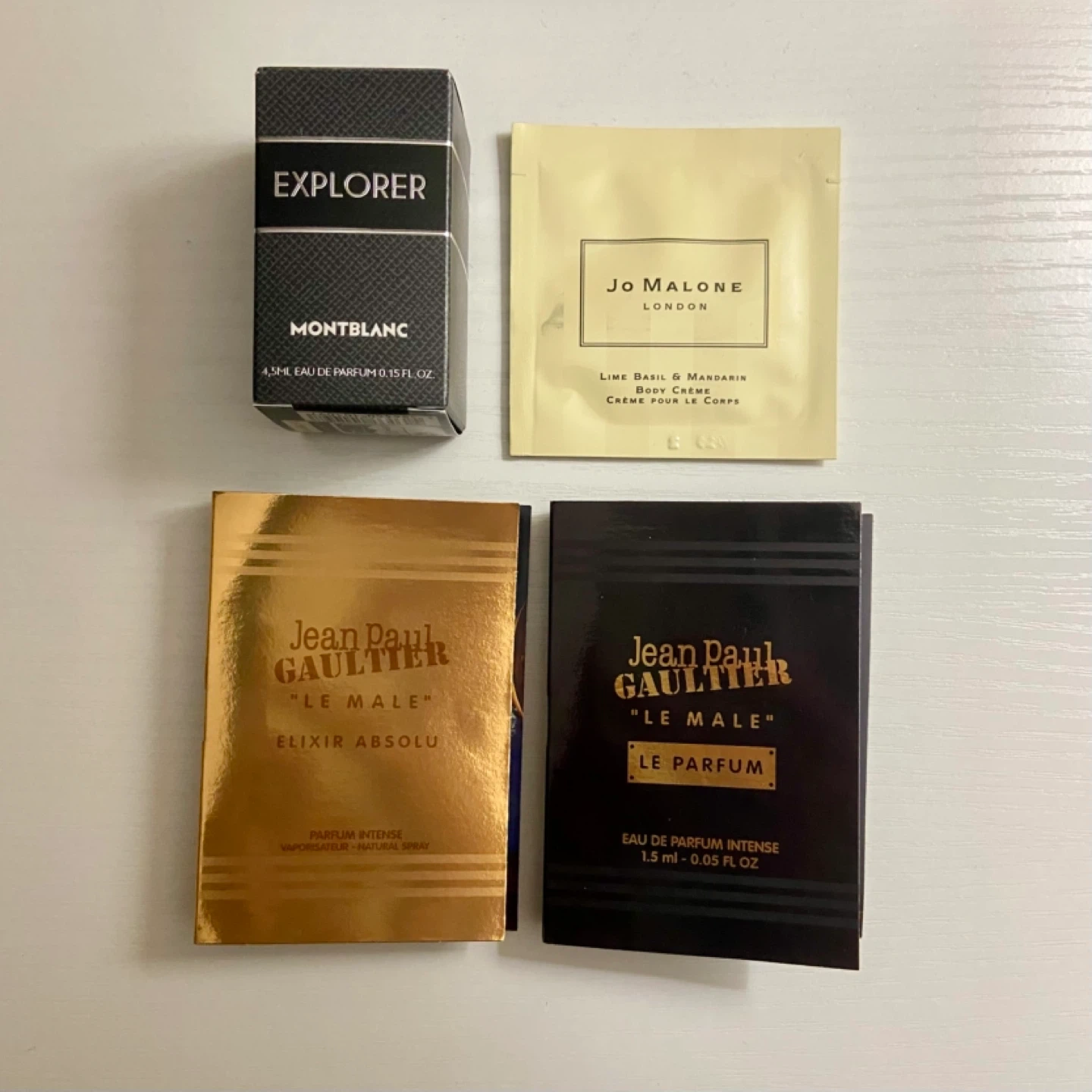 Selling a set of addictive scents: - Montblanc Explorer (4.5ml) - Jo Malone Lime Basil & Mandarin Body Crème (5ml) - Jean Paul Gaultier Le Male Le Parfum (1.5ml) - Jean Paul Gaultier Le Male Elixir Absolu (1.5ml) Perfect for trying out new scents or travel!