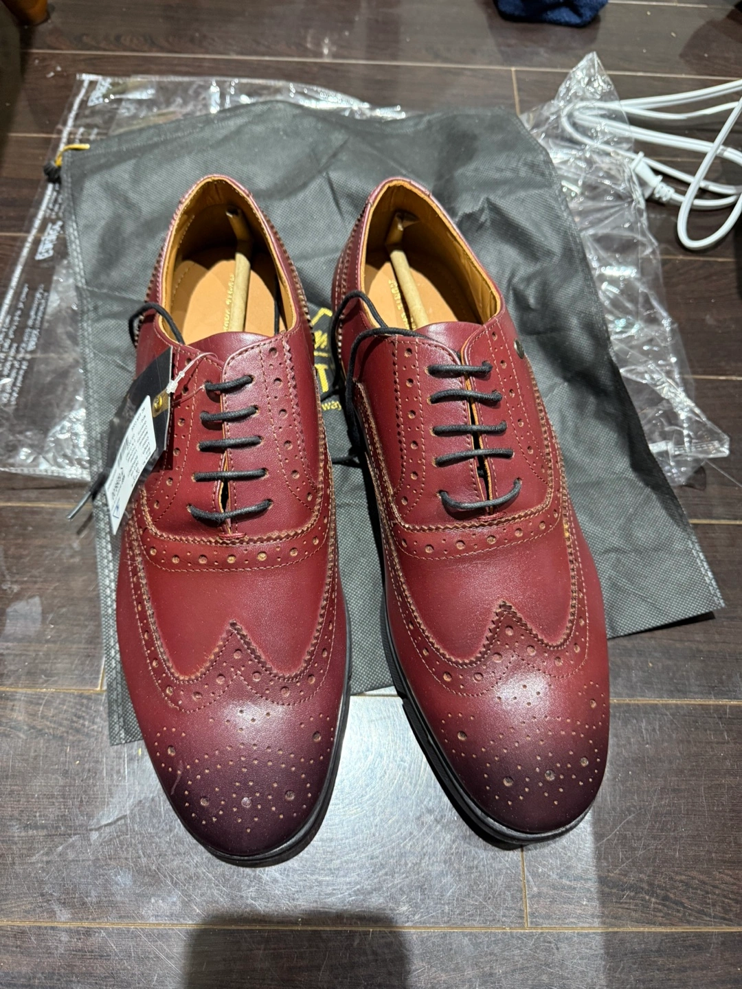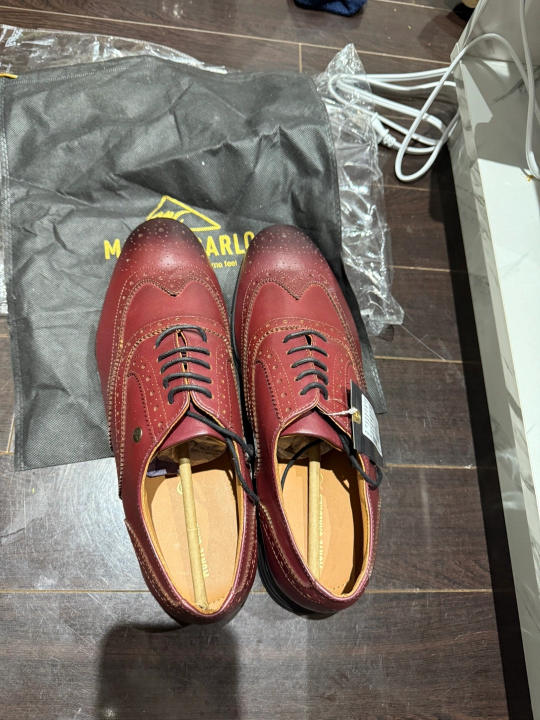 These Monte Carlo wingtip dress shoes are brand new ! They're a stylish burgundy colour and made of leather. Perfect for dressing up for a special occasion or adding a touch of class to your everyday look. Comes with the original dust bag.
