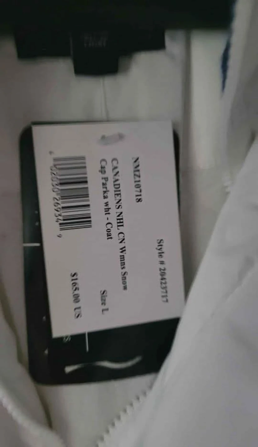 20Selling a Canadiens NHL winter coat in white! It's a size large and looks great for those cold winter days. Originally bought for $165 US.