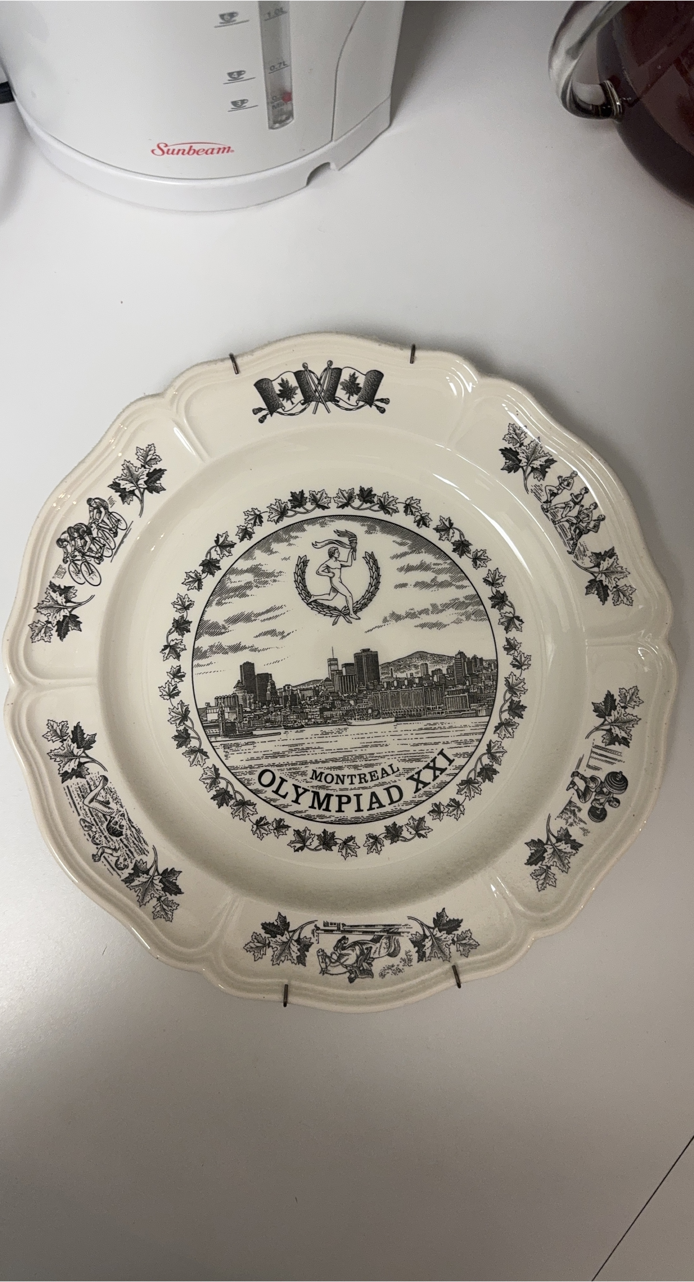 105Selling a commemorative plate from the Montreal 1976 Olympics. It features a black and white design of the Montreal skyline and various Olympic sports around the rim. Perfect for collectors or anyone who loves Montreal history!