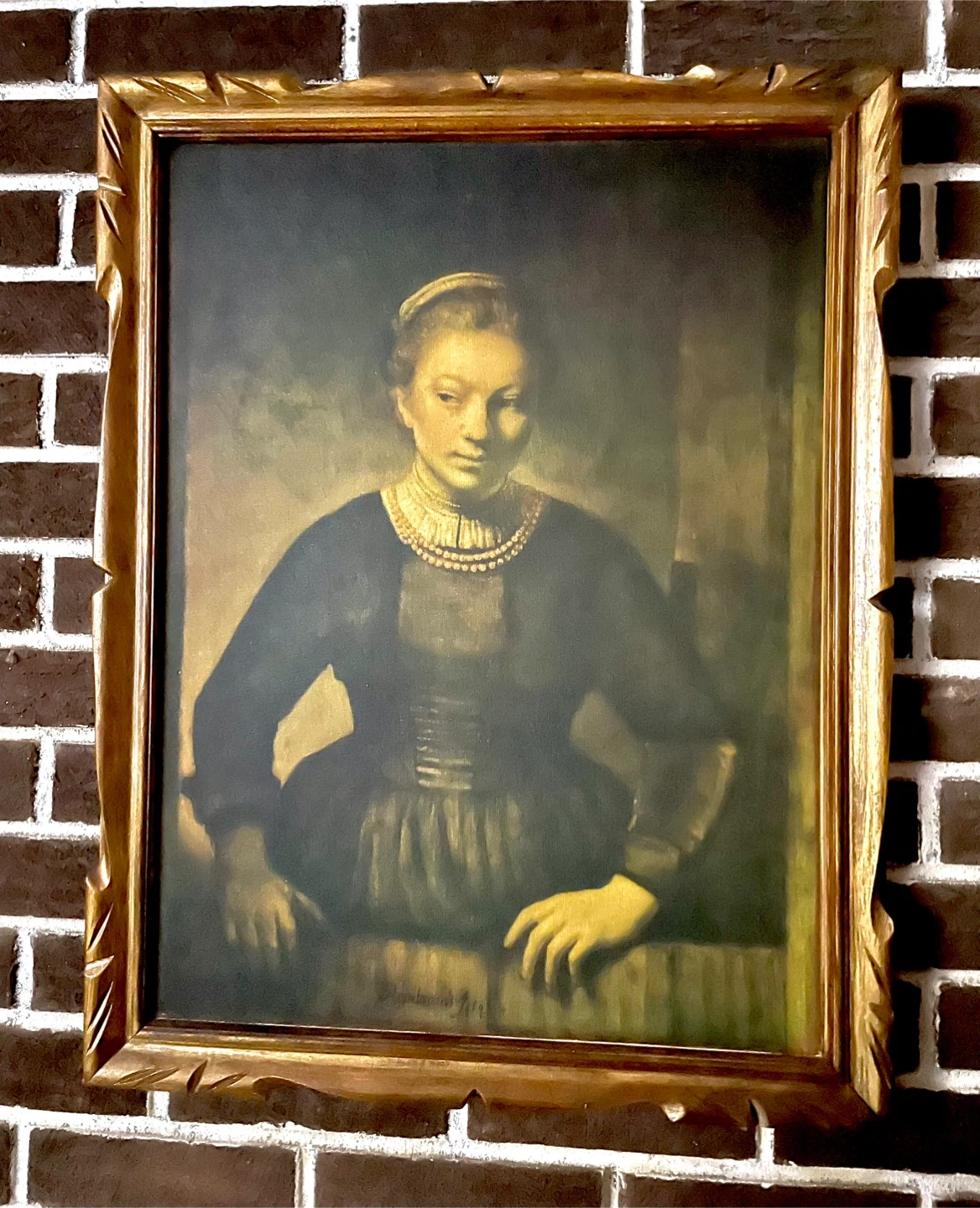887The artwork is attributed to the Dutch painter Rembrandt van Rijn and his workshop, and it was completed in 1645. The painting is known for its use of light and shadow, which illuminates the woman's face. The subject of the painting, a young woman, is depicted leaning through a wooden doorway. The painting is housed at the Art Institute of Chicago It has a gold-coloured frame and is in good condition.