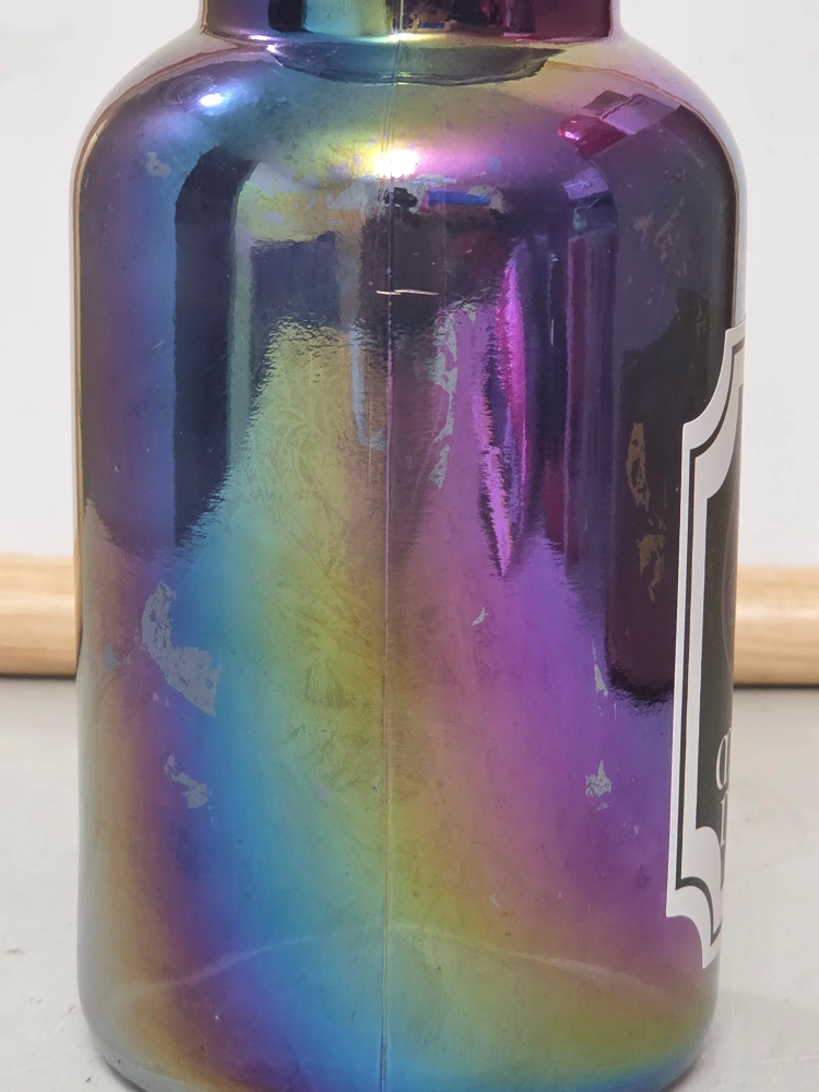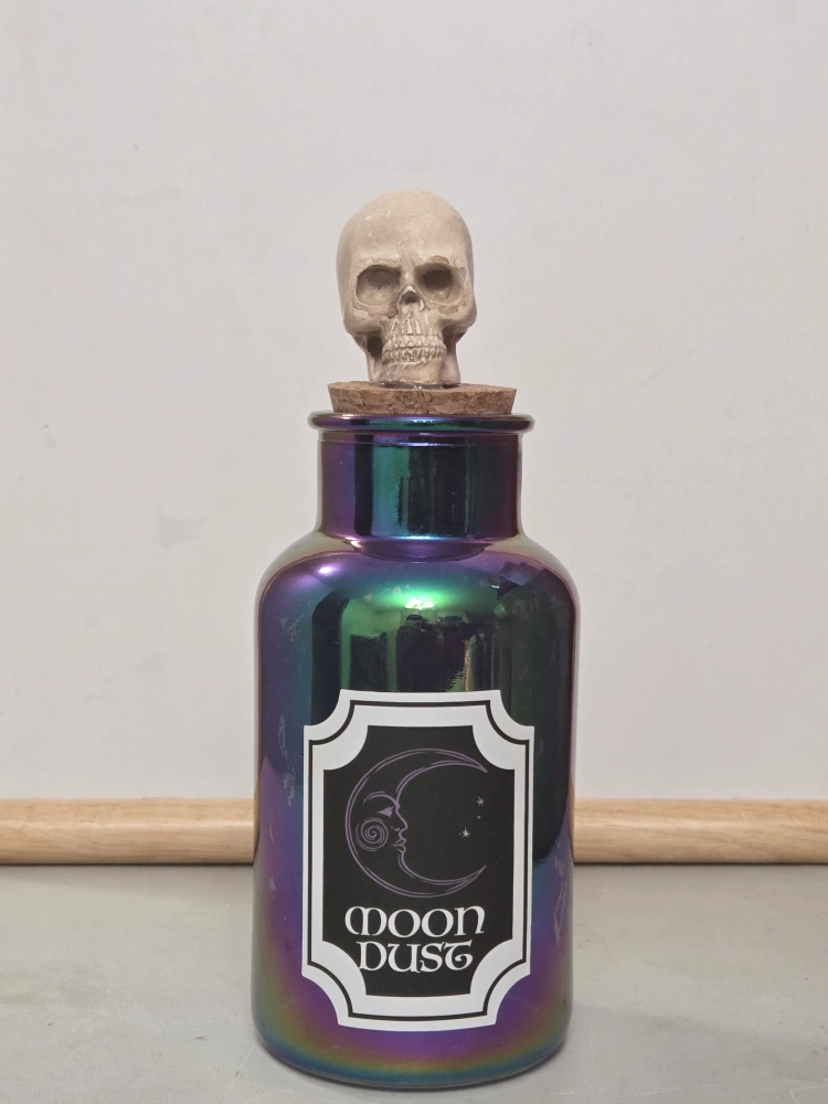 55Add a touch of mystique to your space with this unique Moon Dust bottle. It features a cool iridescent finish and a skull stopper for a bit of gothic charm. Perfect for decor or potion-making!