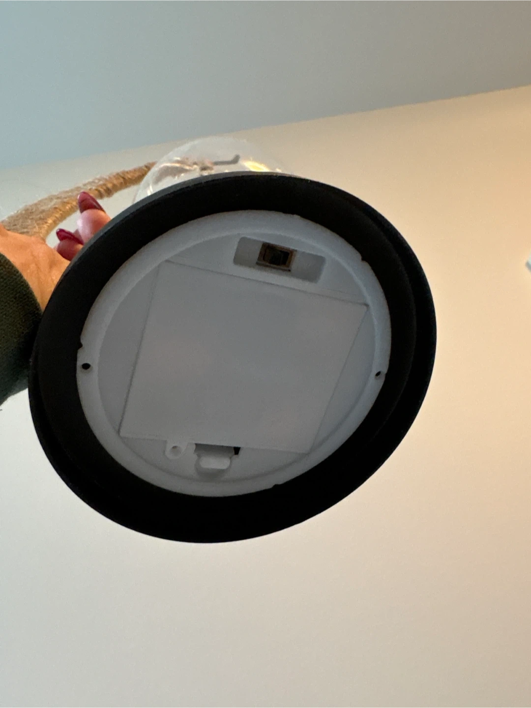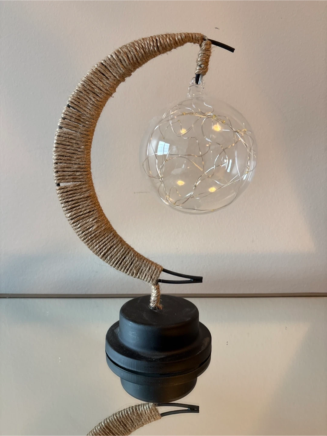 Add a touch of whimsy to your space with this cute moon-shaped table lamp! It features a clear glass ball filled with fairy lights, suspended from a jute-wrapped crescent moon stand. Perfect for a bedside table or shelf, it casts a soft, warm glow! Only turned on a few times, just not my style anymore!