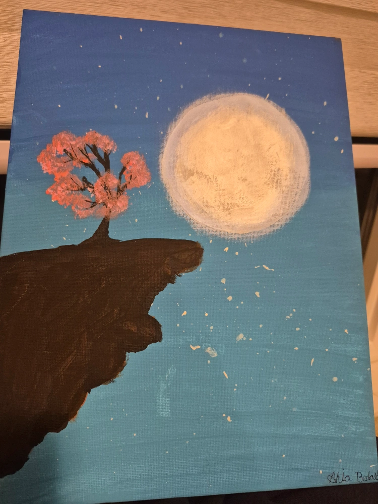 An extremely admirable painting of a cherry blossom tree planted on a cliff with a glowing moon behind it. Just waiting to be hung up on someone's wall! CASH ONLY
