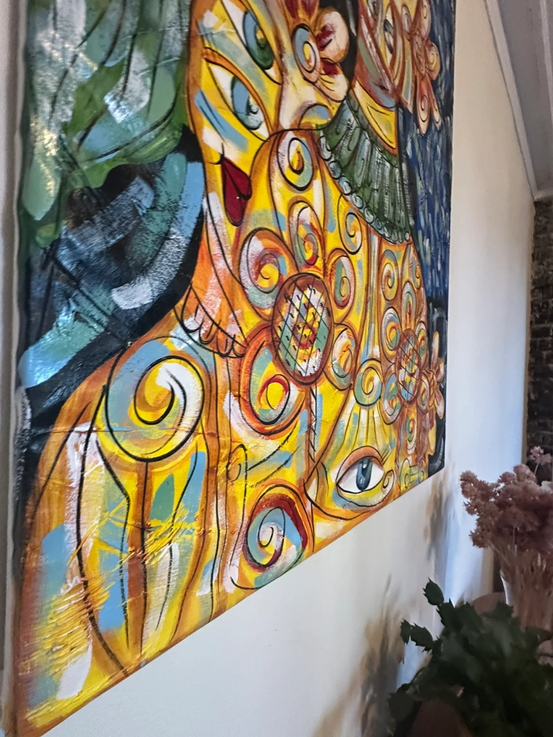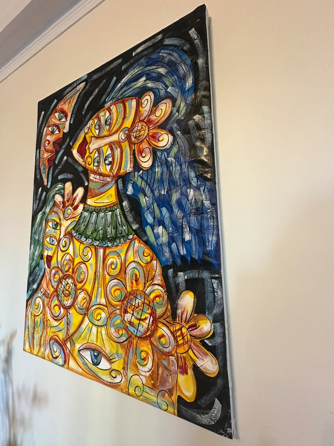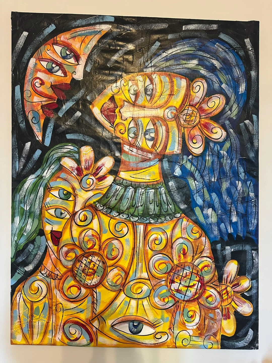 Infused with the vibrant spirit of Cuba, Moonlit Muse combines bold Cubist and Surrealist elements in glowing golds, deep blues, and swirling patterns. • Origin: Hand-painted in Cuba • Medium: Acrylic on canvas • One-of-a-kind statement piece • Rich colors and intricate details that invite discovery