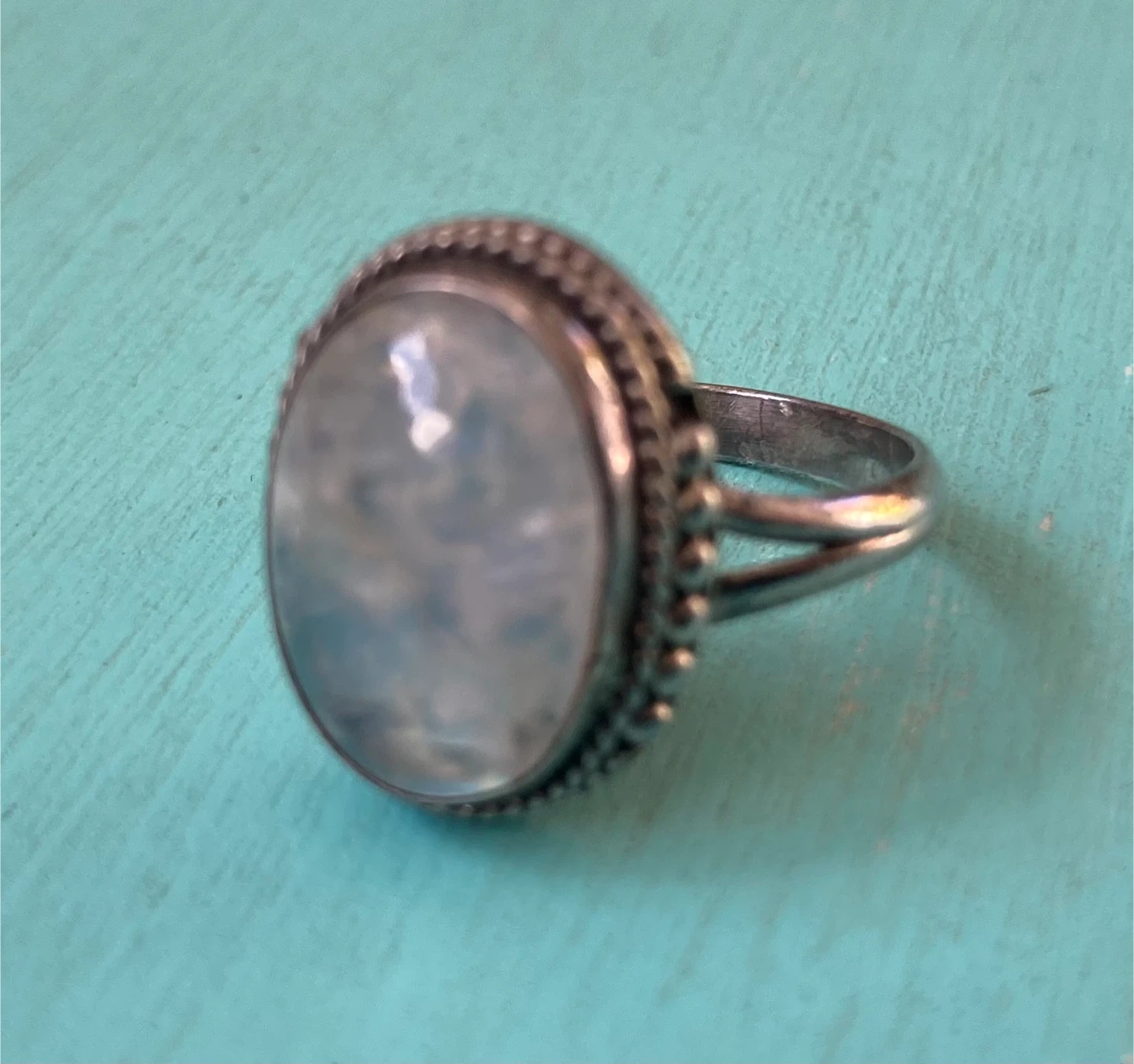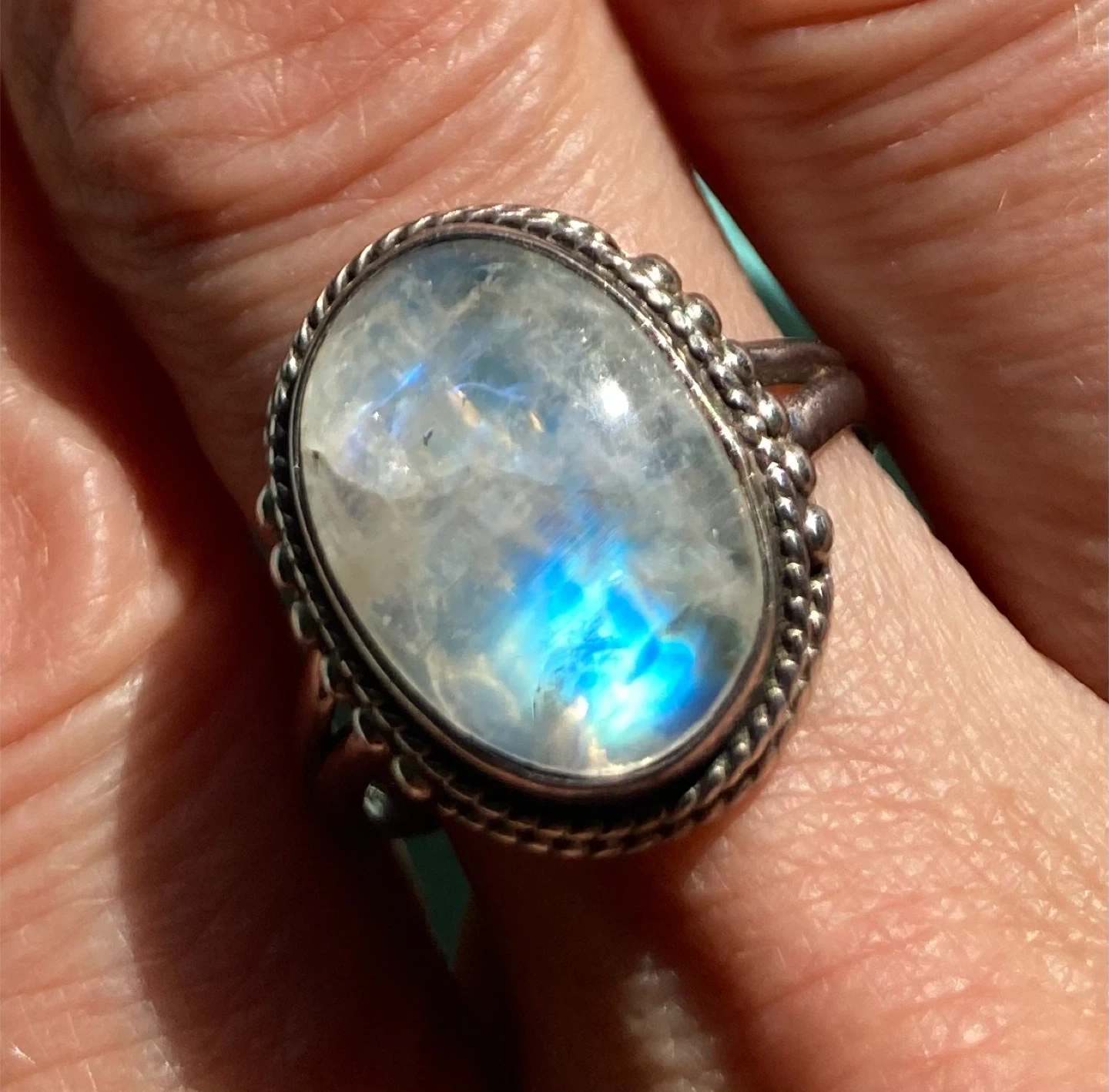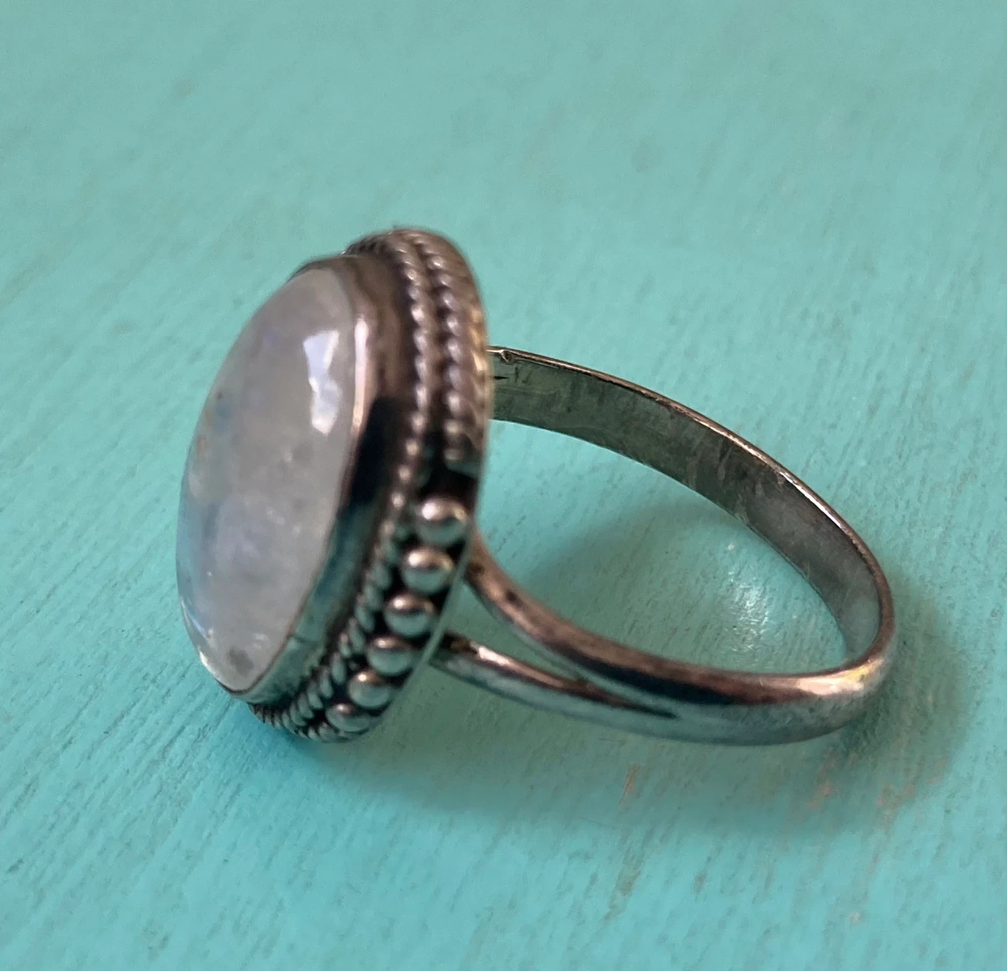 a beautiful silver ring with a polished moonstone cabuchon. the gorgeous blue glow of the moonstone suits every skin colour, and is just so lovely. size 8, i believe. in perfect used condition.