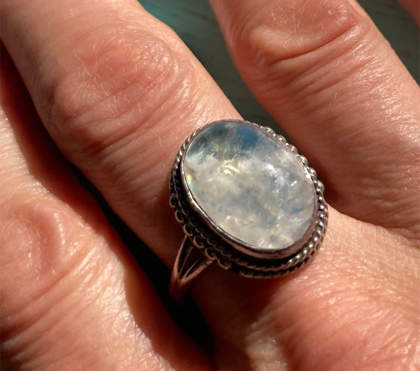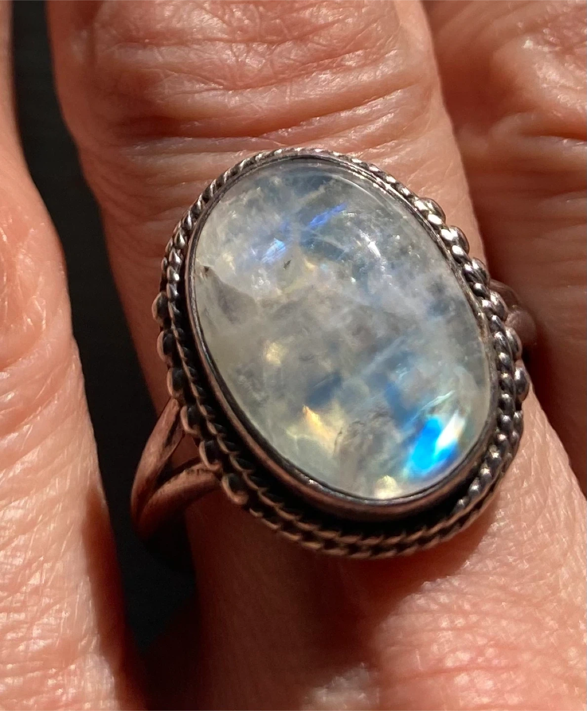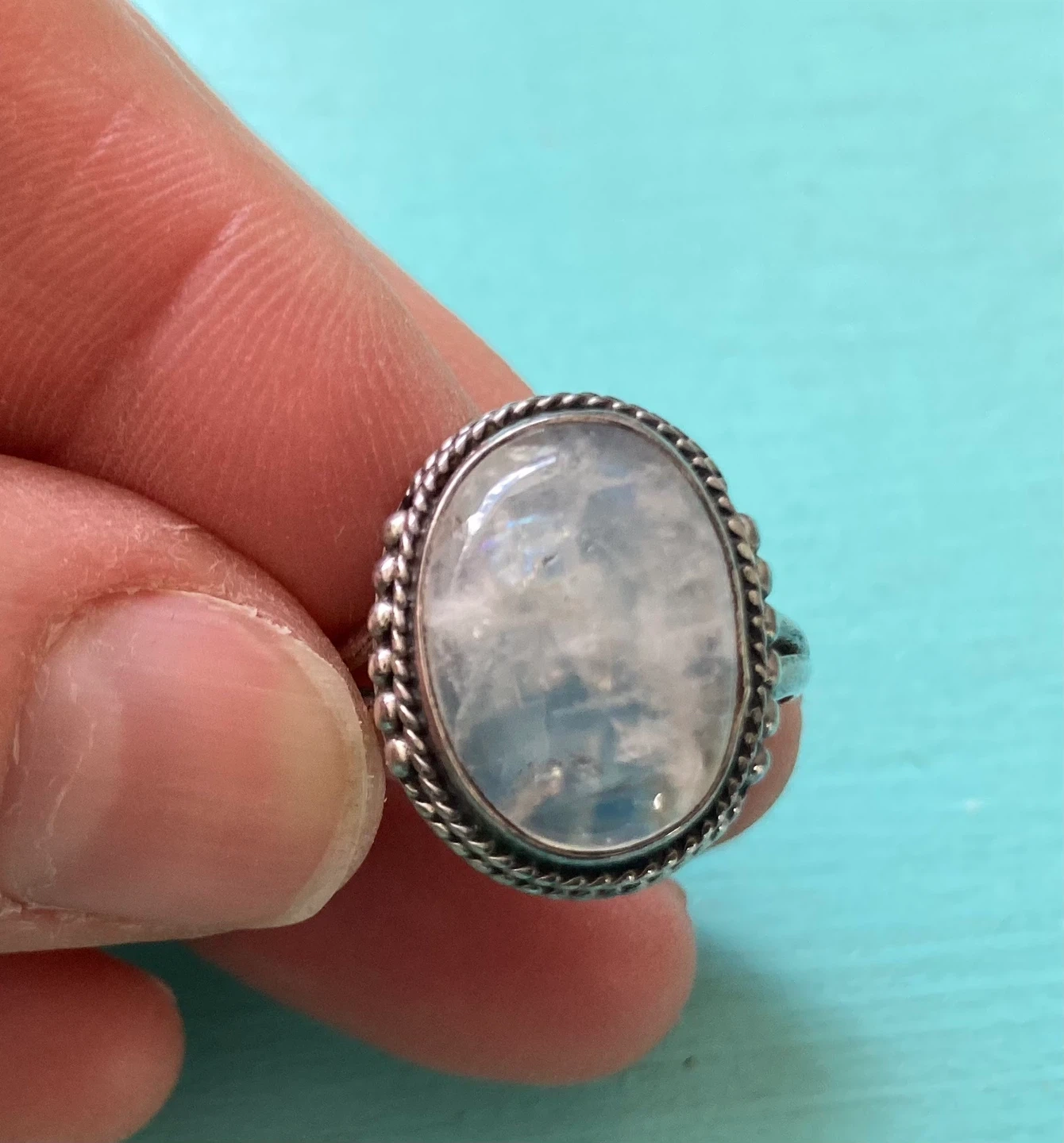 a beautiful silver ring with a polished moonstone cabuchon. the gorgeous blue glow of the moonstone suits every skin colour, and is just so lovely. size 8, i believe. in perfect used condition.