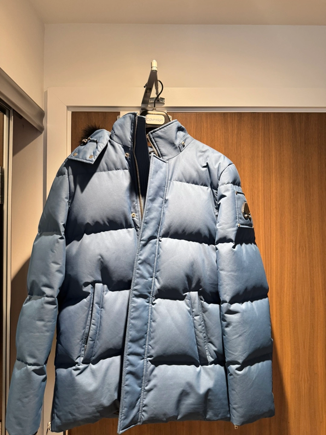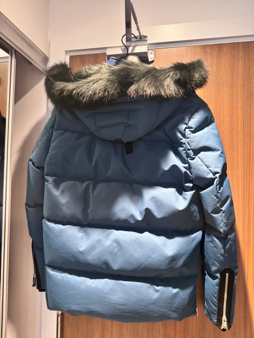 I'm selling a Moose knuckle down puffer jacket in a nice blue colour. It's in great condition and ready for the cold weather. It features a fur-trimmed hood and a stylish design. Feel free to ask any questions you may have!