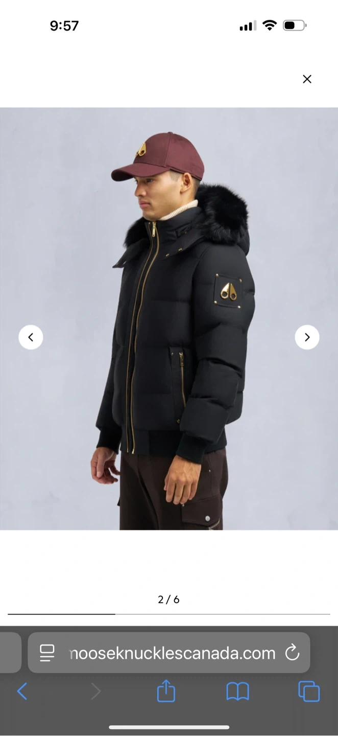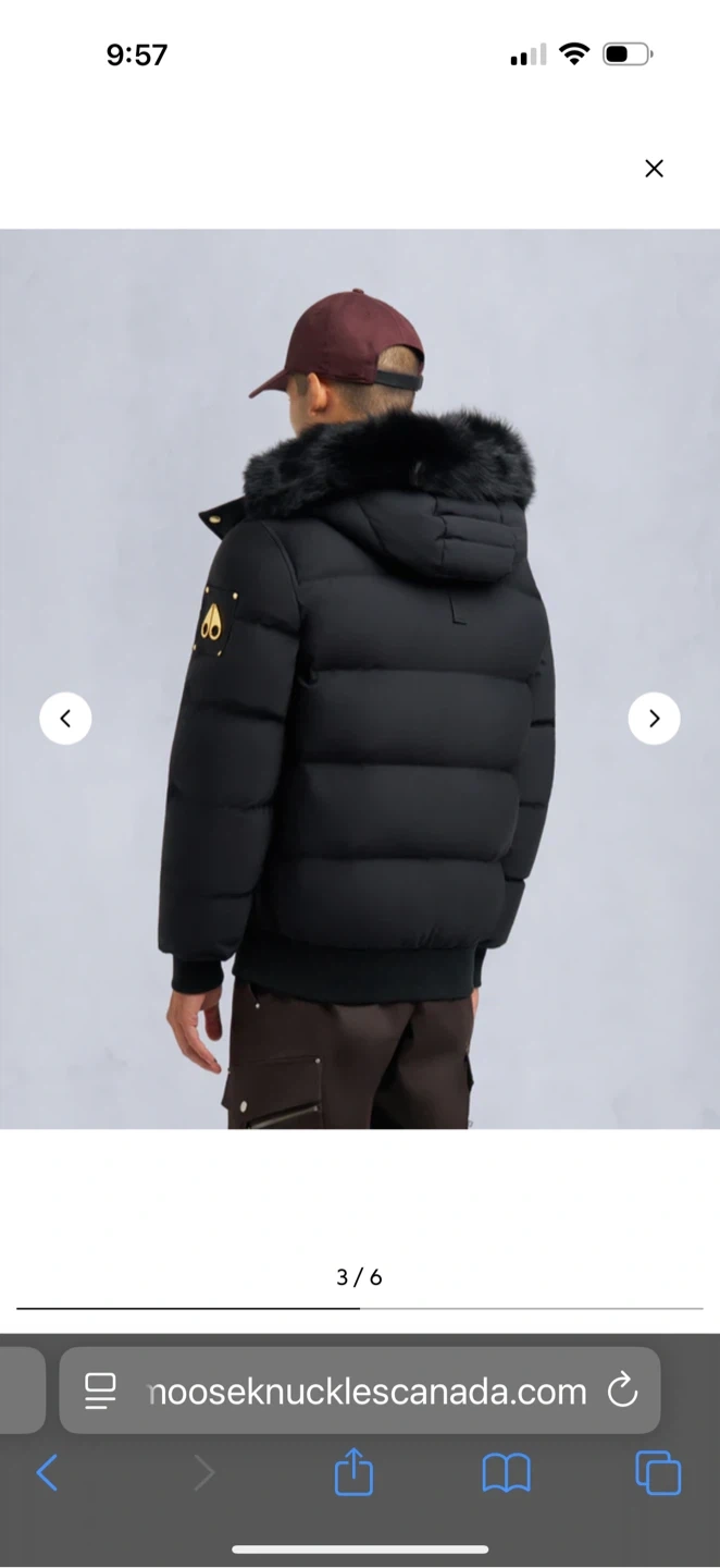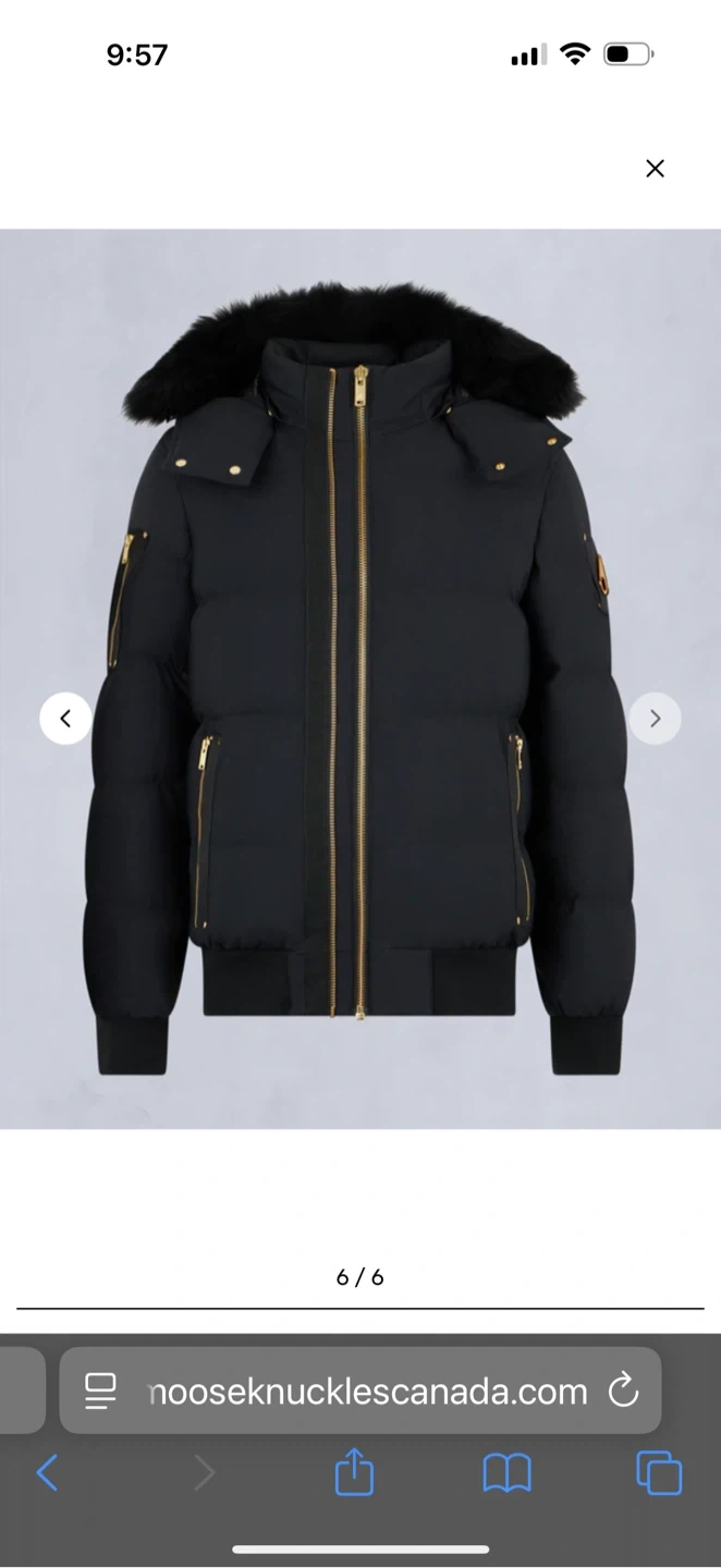 5Here's a stylish black bomber jacket from Moose Knuckles! It's in great shape and ready to keep you warm this winter. The gold zippers and logo add a touch of flair to this classic design. Perfect for braving the Canadian weather!
