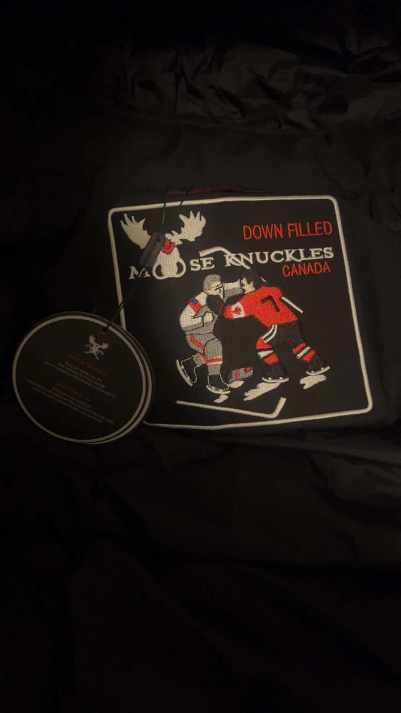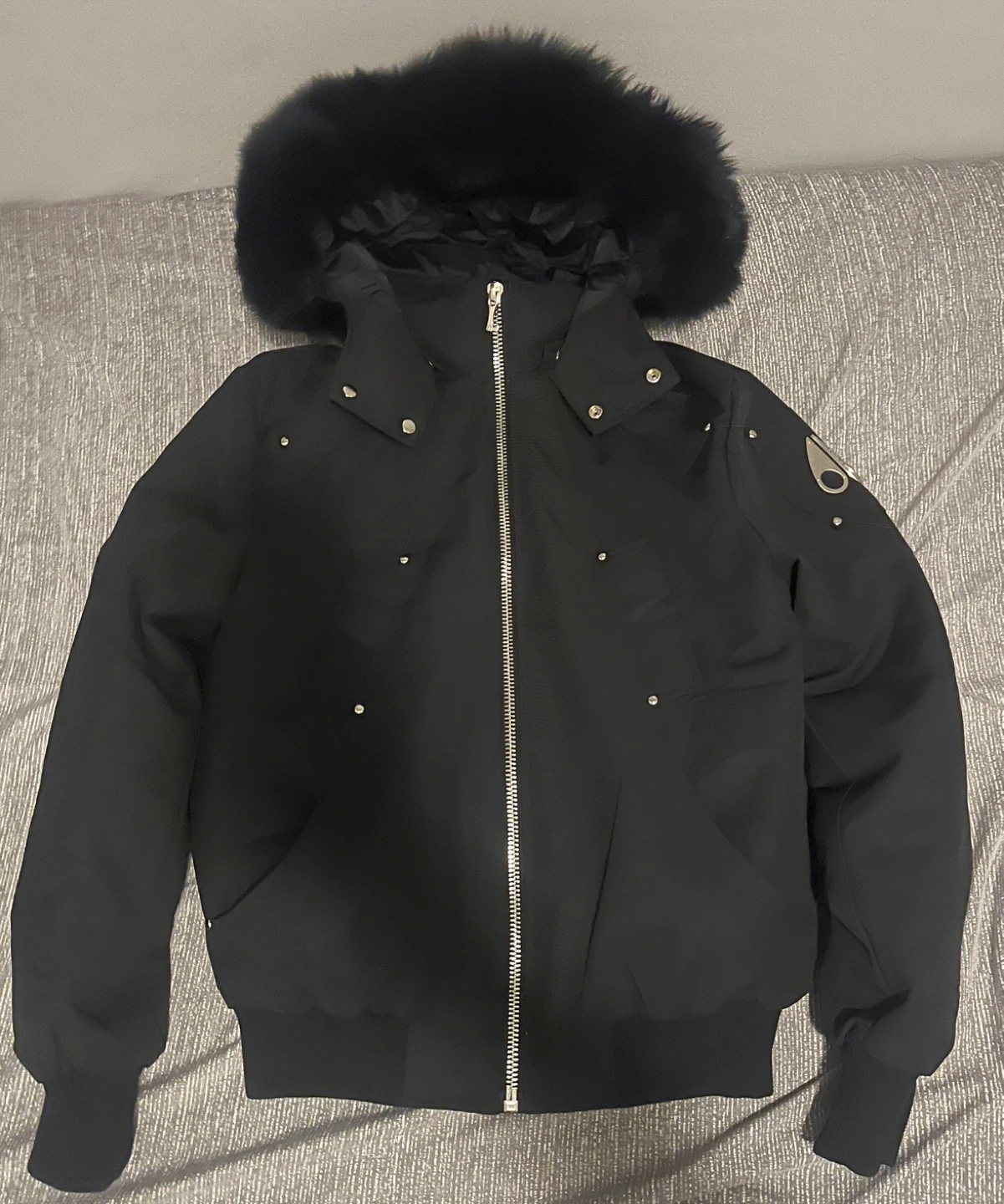 Selling a Moose Knuckles black down-filled bomber jacket. It's in great condition and ready to keep you warm this winter season! The jacket features the iconic Moose Knuckles logo and a stylish fur-trimmed hood.