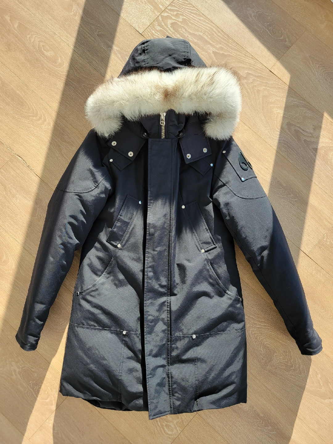 10Selling a Moose Knuckles black down parka in size Small. It's in great condition and ready to keep you warm this winter! The parka features a fur-trimmed hood and the iconic Moose Knuckles logo on the sleeve.