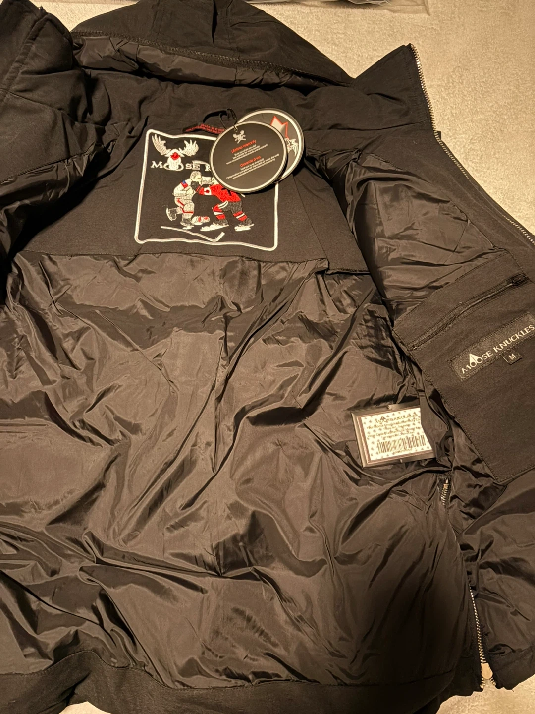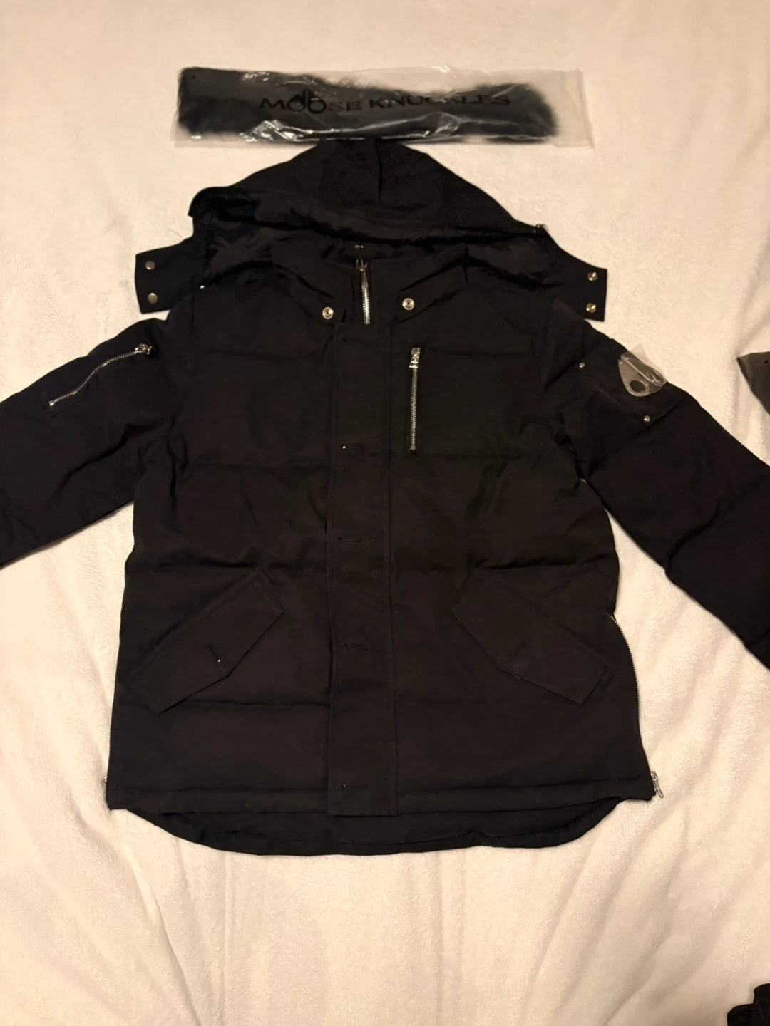 10Selling a Moose Knuckles down puffer jacket in black. It features the signature Moose Knuckles logo on the sleeve. The jacket has a fur-trimmed hood and silver -tone hardware. It's in great condition and ready for a new owner!