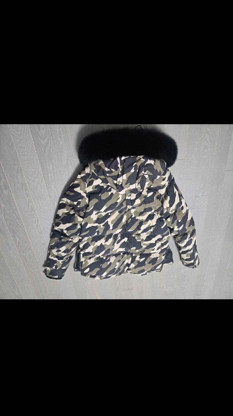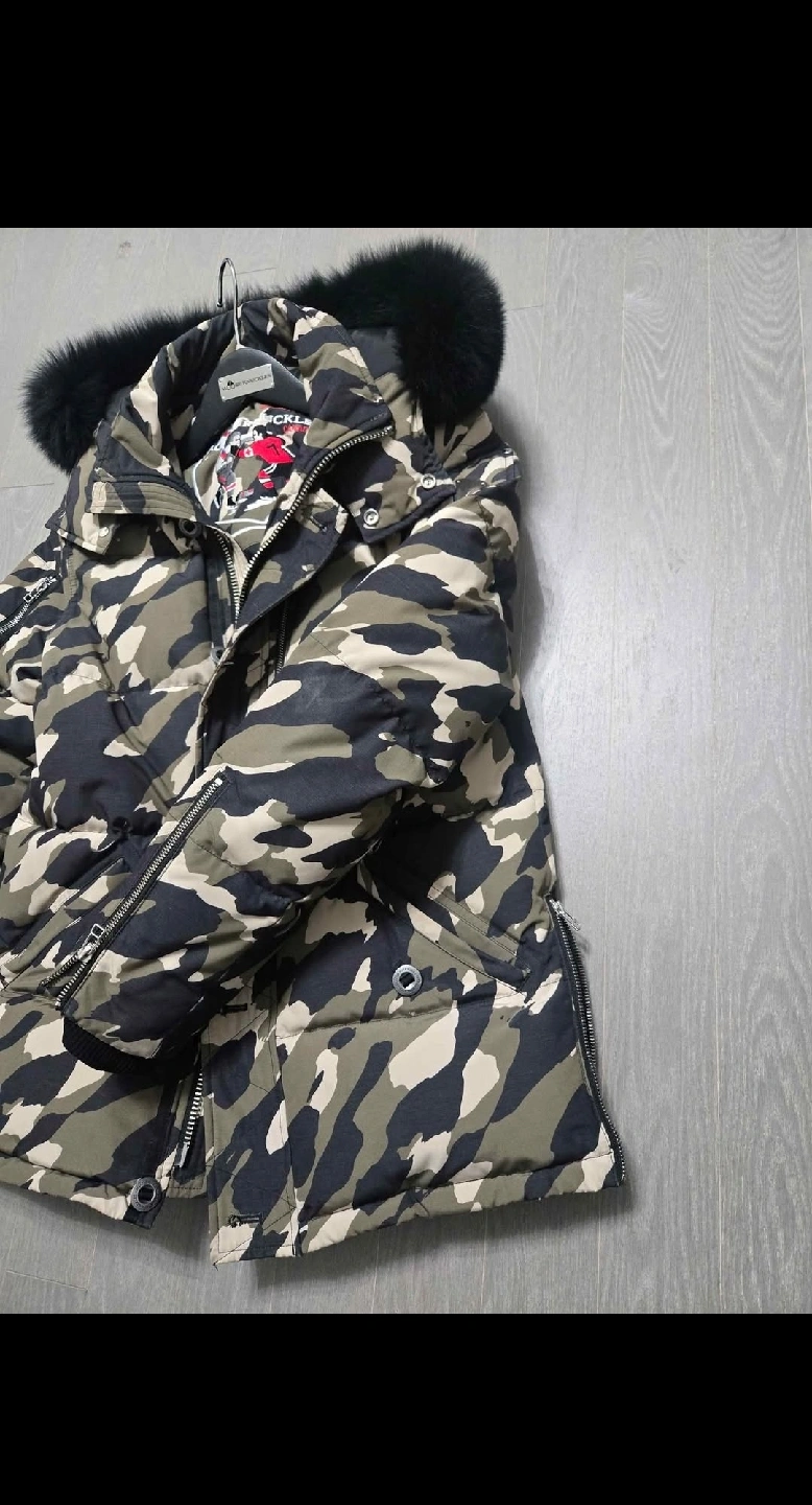 Selling a Moose Knuckles puffer jacket in a camo pattern. It's a size small and features a fur-trimmed hood. Perfect for staying warm and stylish this winter!