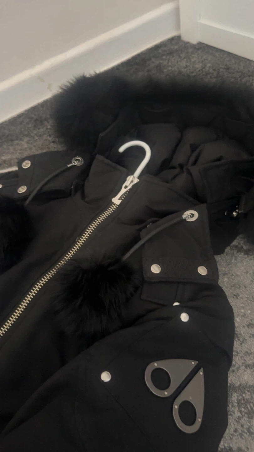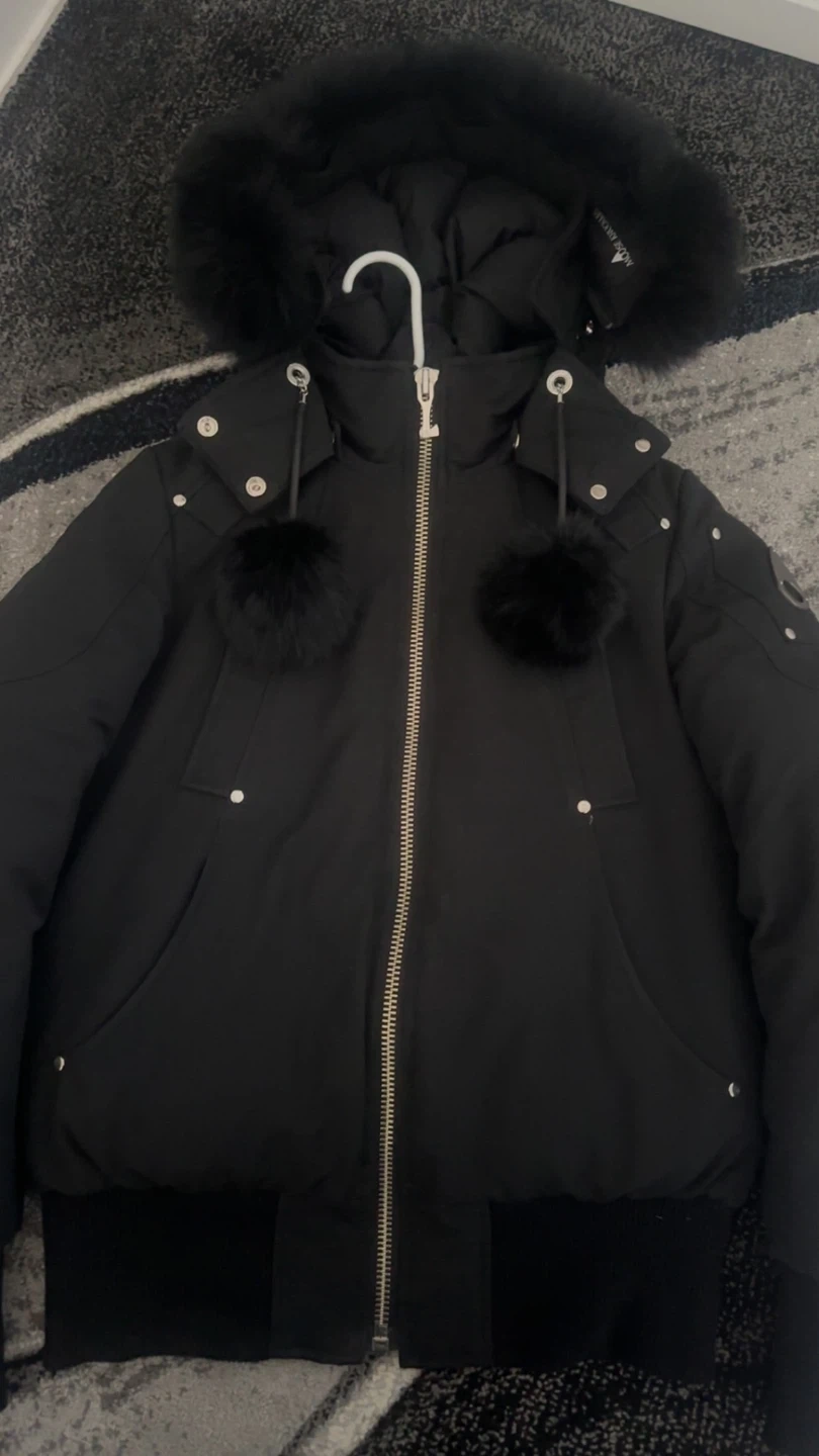 10Selling a Moose Knuckles down-filled bomber jacket in black. It's in great condition and super warm for those cold Canadian winters! Pom poms and fur came separate SIZE- Medium baught it for around $900