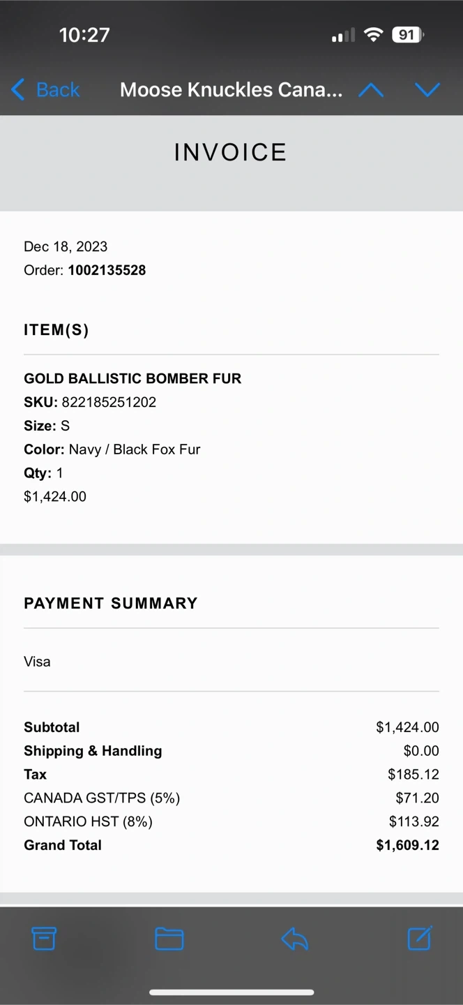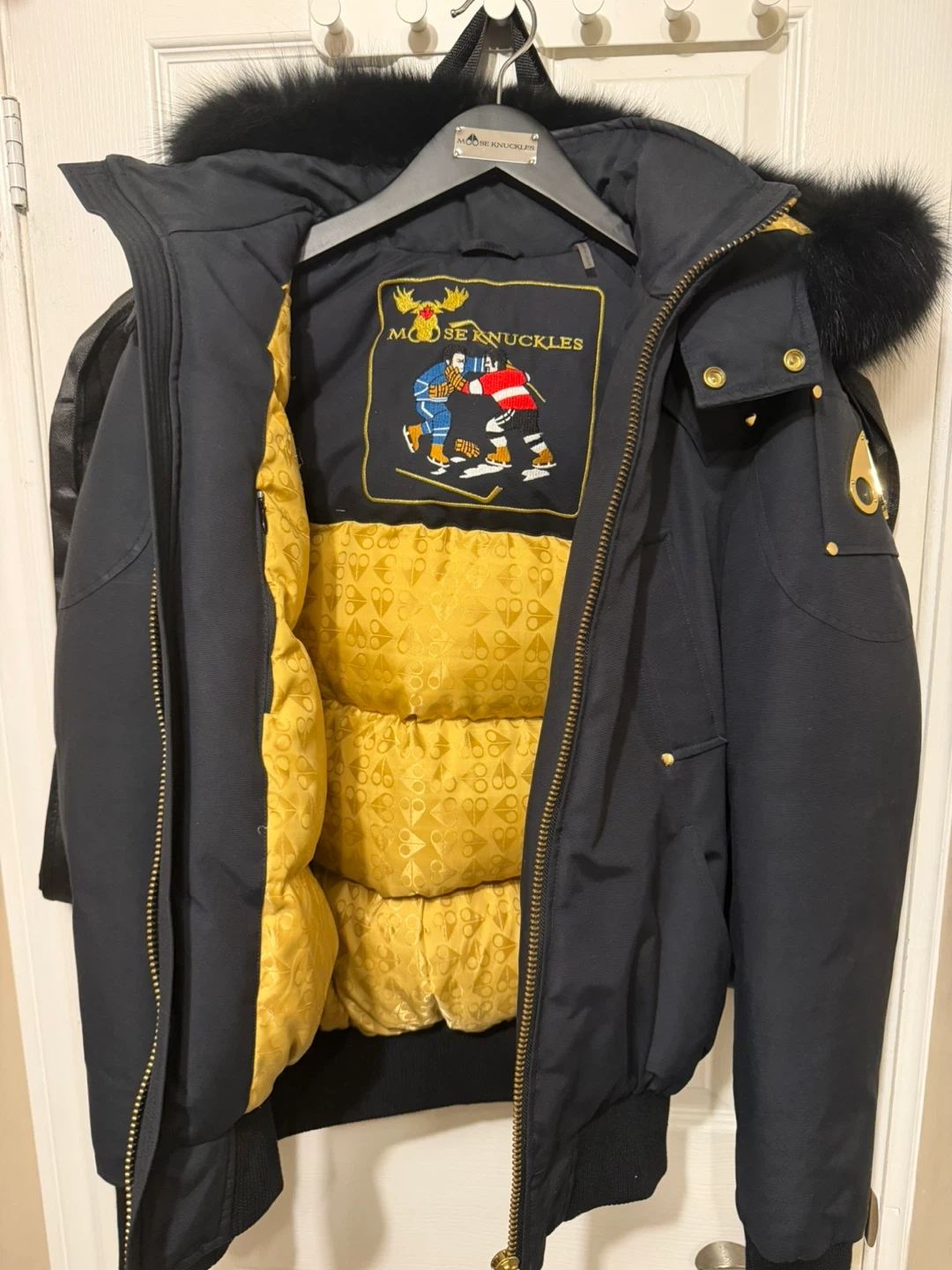 60Selling a Moose Knuckles Gold Ballistic Bomber Fur in size small. The jacket is navy with black fox fur trim. Originally bought for $1,424 plus tax.
