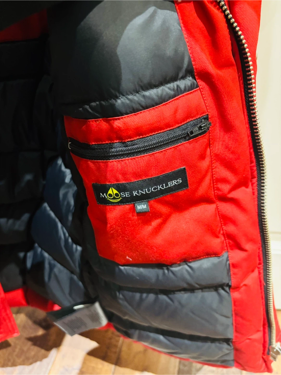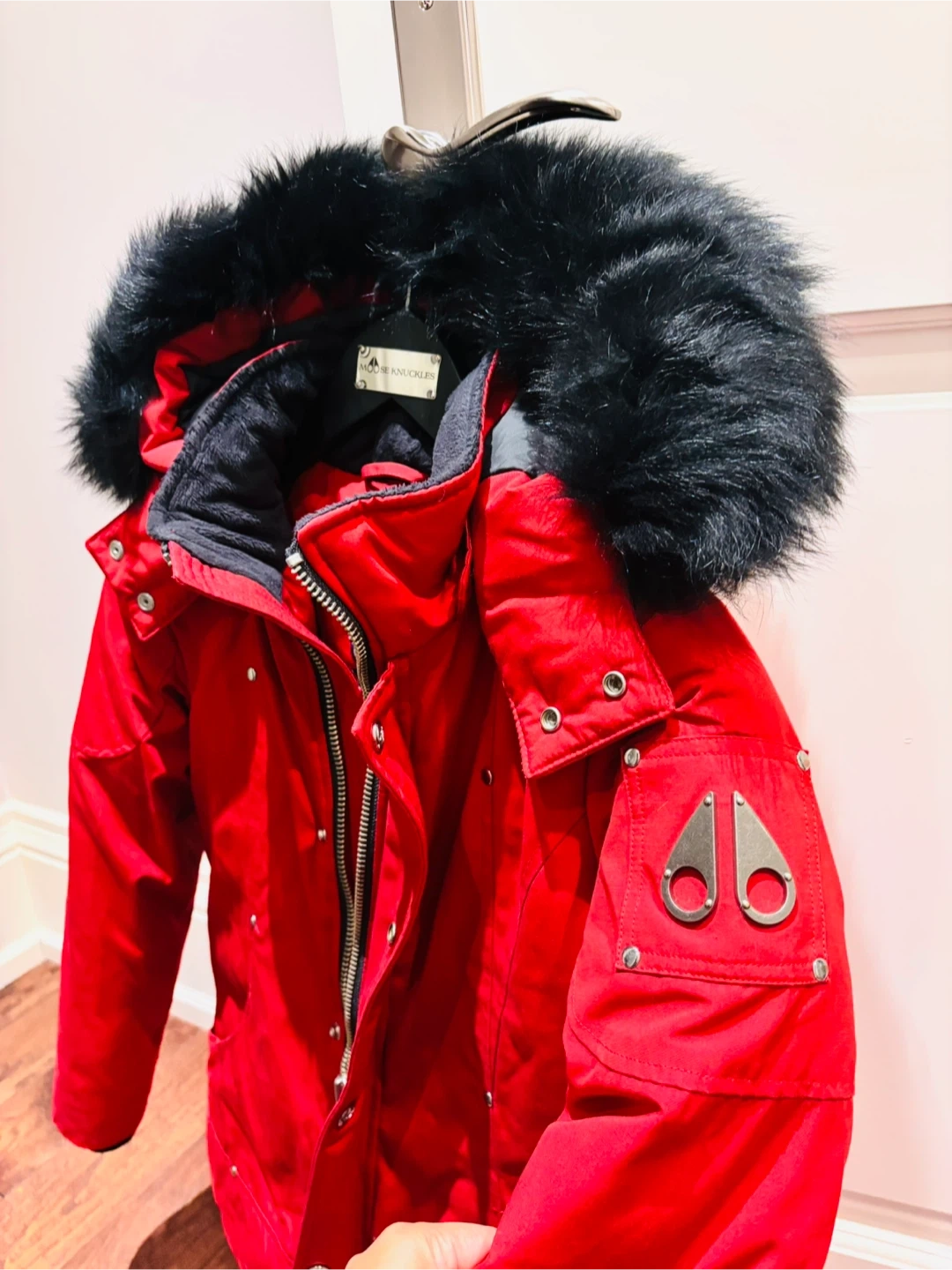 Selling a stylish Moose Knuckles “kids” bomber jacket in a vibrant red colour! It's a size M/M. The jacket features a black real fur-trimmed hood and the signature Moose Knuckles logo on the sleeve. Perfect for staying warm and fashionable during the colder months!