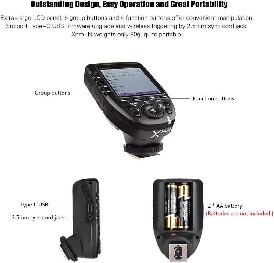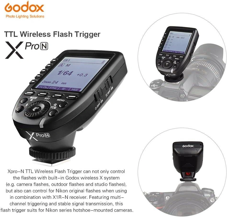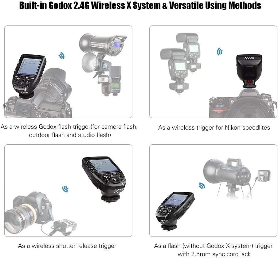 Built-in Godox 2.4G wireless X system & versatile using methods. As a wireless Godox flash trigger(for camera flash, outdoor flash and studio flash); As a wireless trigger for Nikon speedlites; As a wireless shutter release trigger; As a flash (without Godox X system) trigger with 2.5mm sync cord jack.