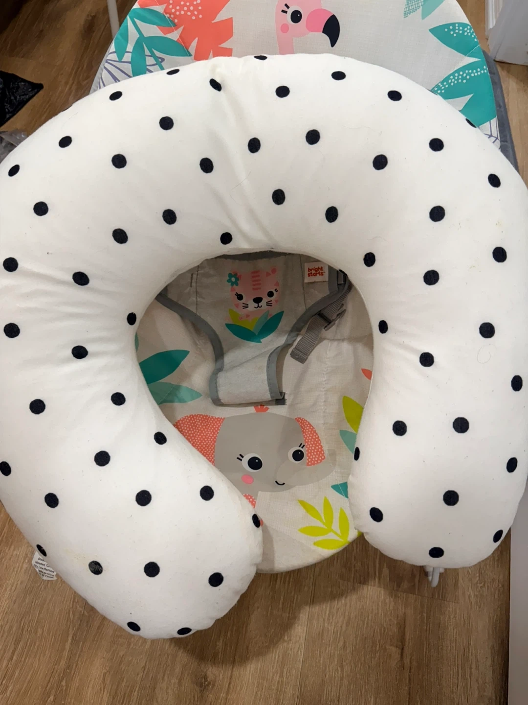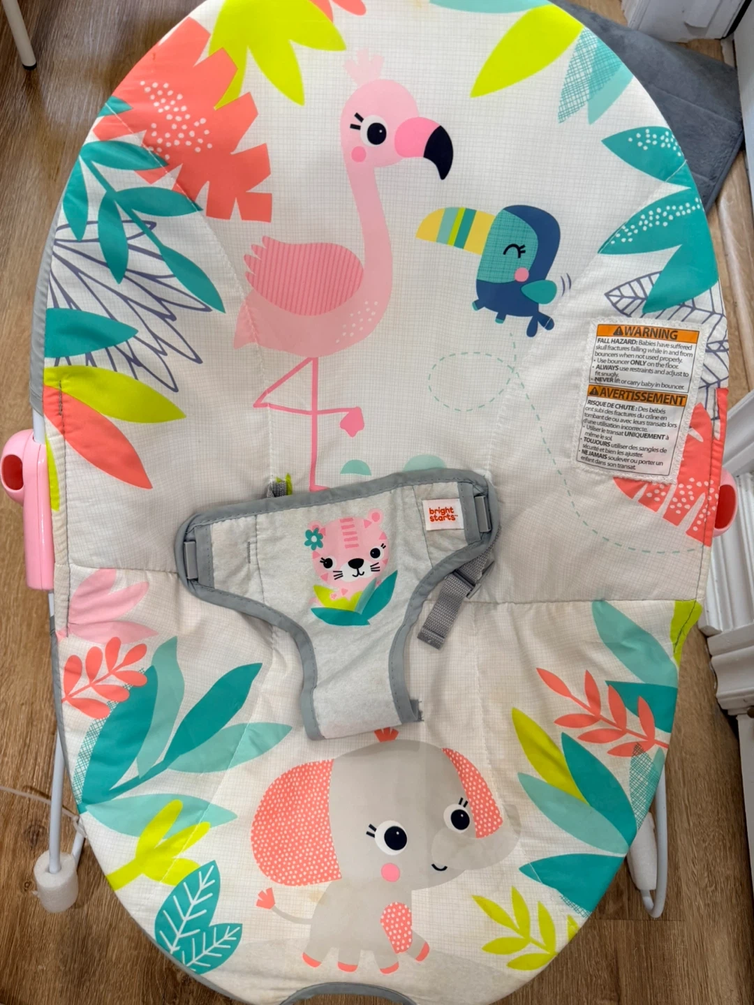 This bright and colourful baby bouncer seat features a fun tropical print with a flamingo and toucan. It includes a comfy padded seat and harness for your little one's safety.