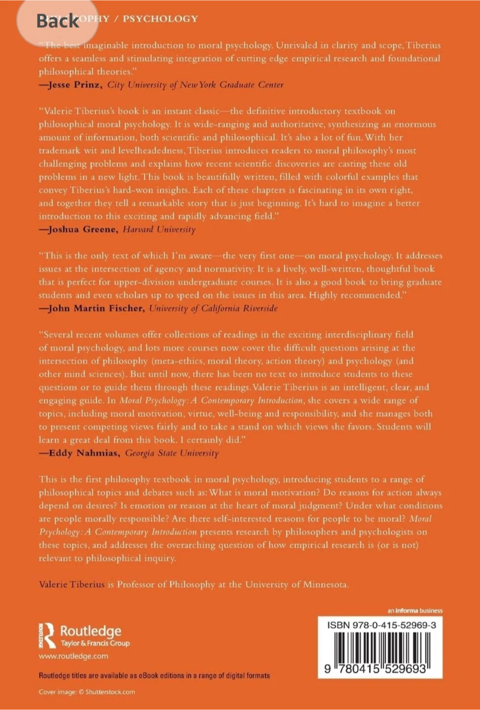 15Selling a copy of "Moral Psychology: A Contemporary Introduction" by Valerie Tiberius. This book provides an accessible and stimulating introduction to moral psychology. It's a wide-ranging and authoritative textbook, synthesizing an enormous amount of information, both scientific and philosophical