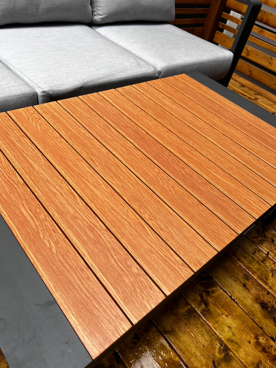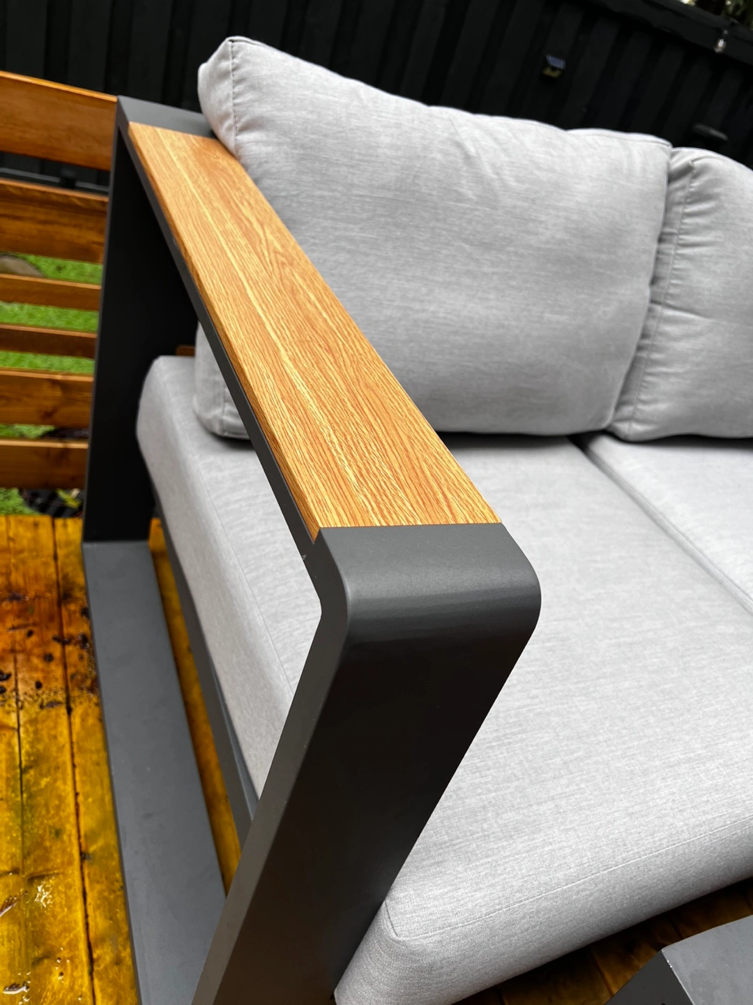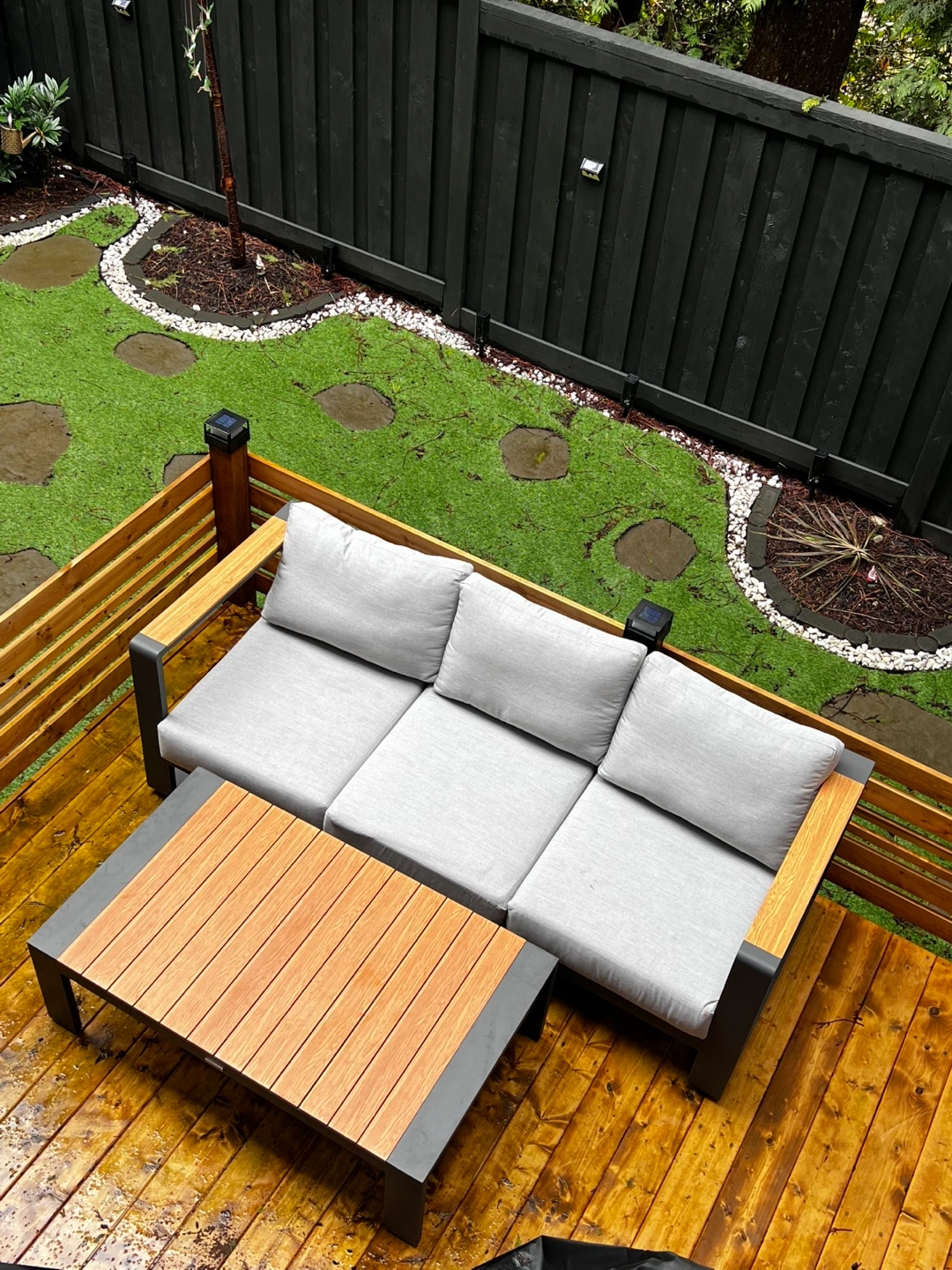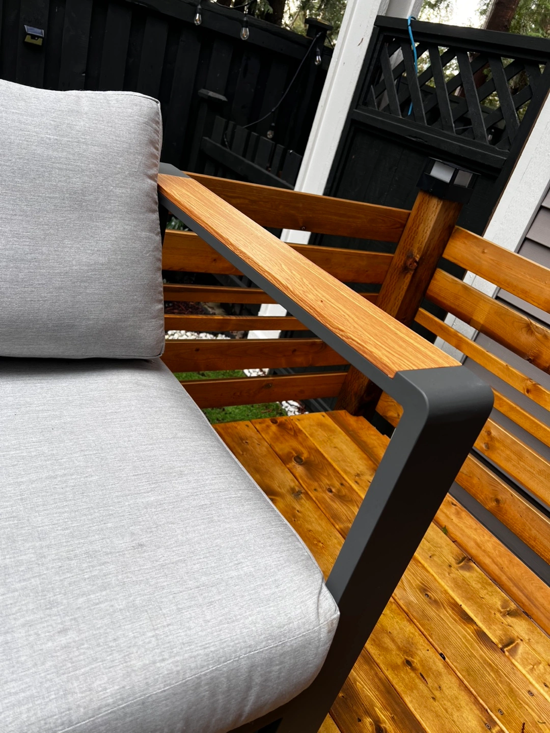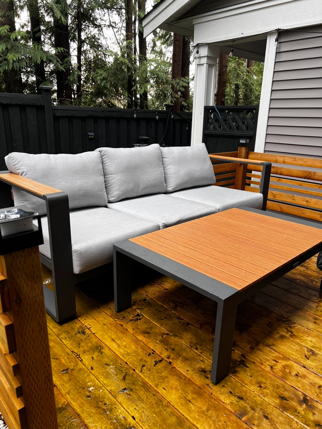 15Modern outdoor patio furniture set. Includes a three-seater sofa and coffee table. Aluminum frame with wood-look top and grey cushions. Excellent for entertaining. ( Delivery Available)