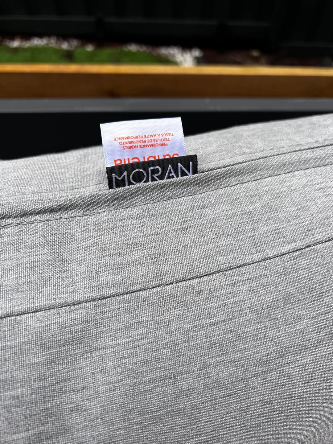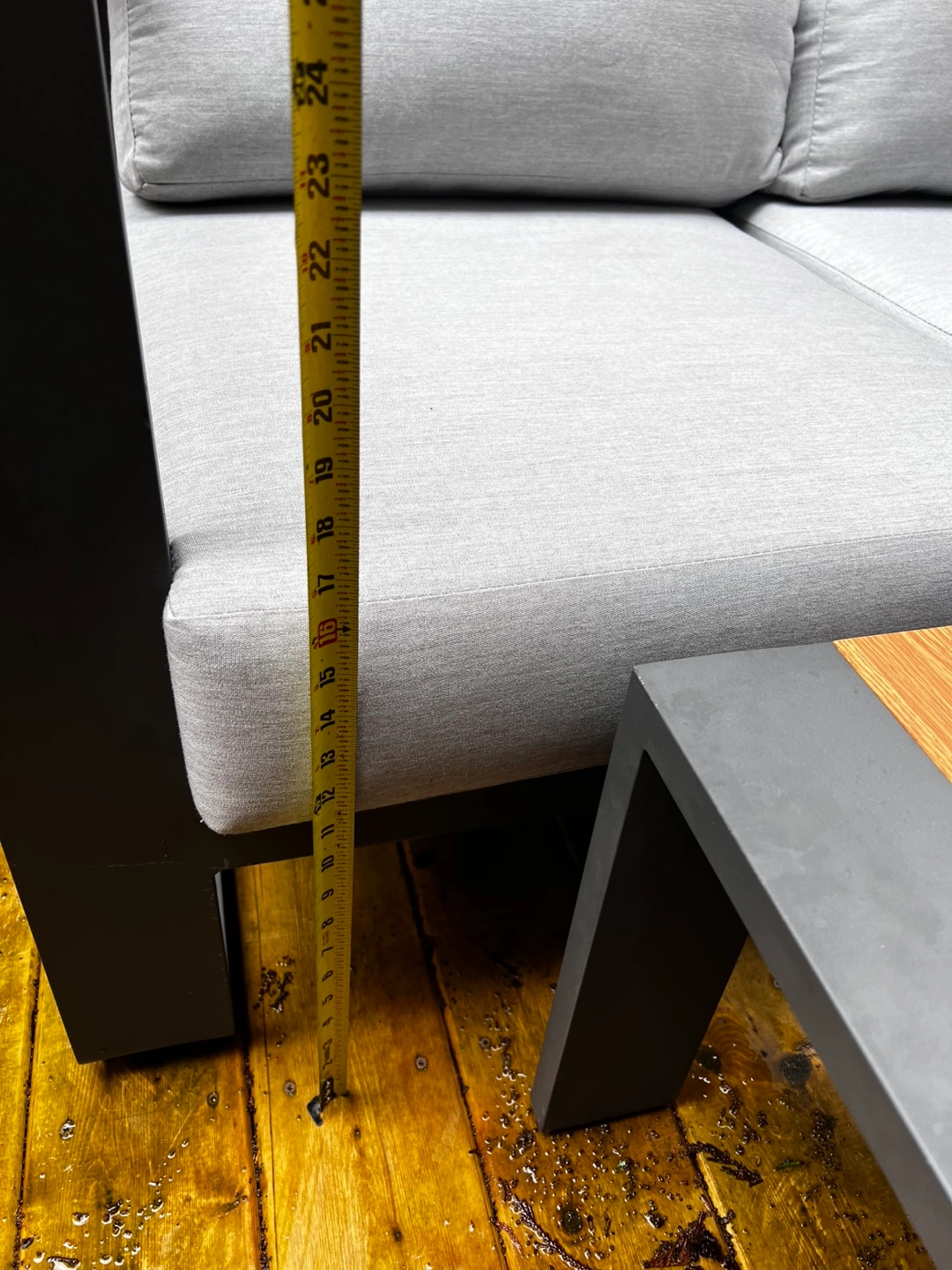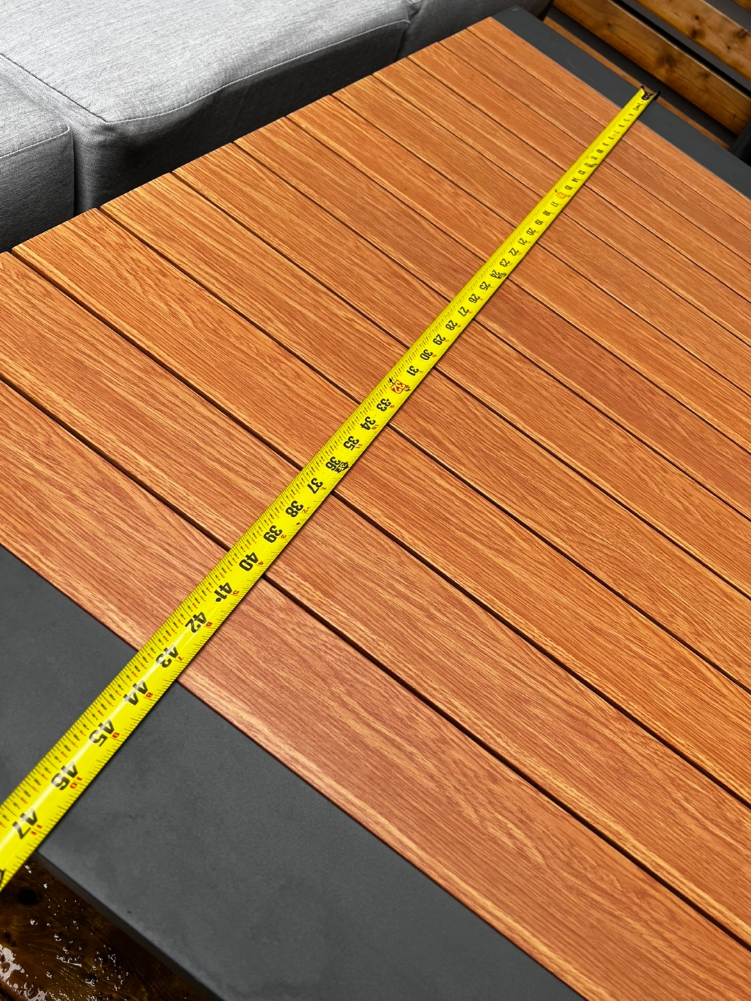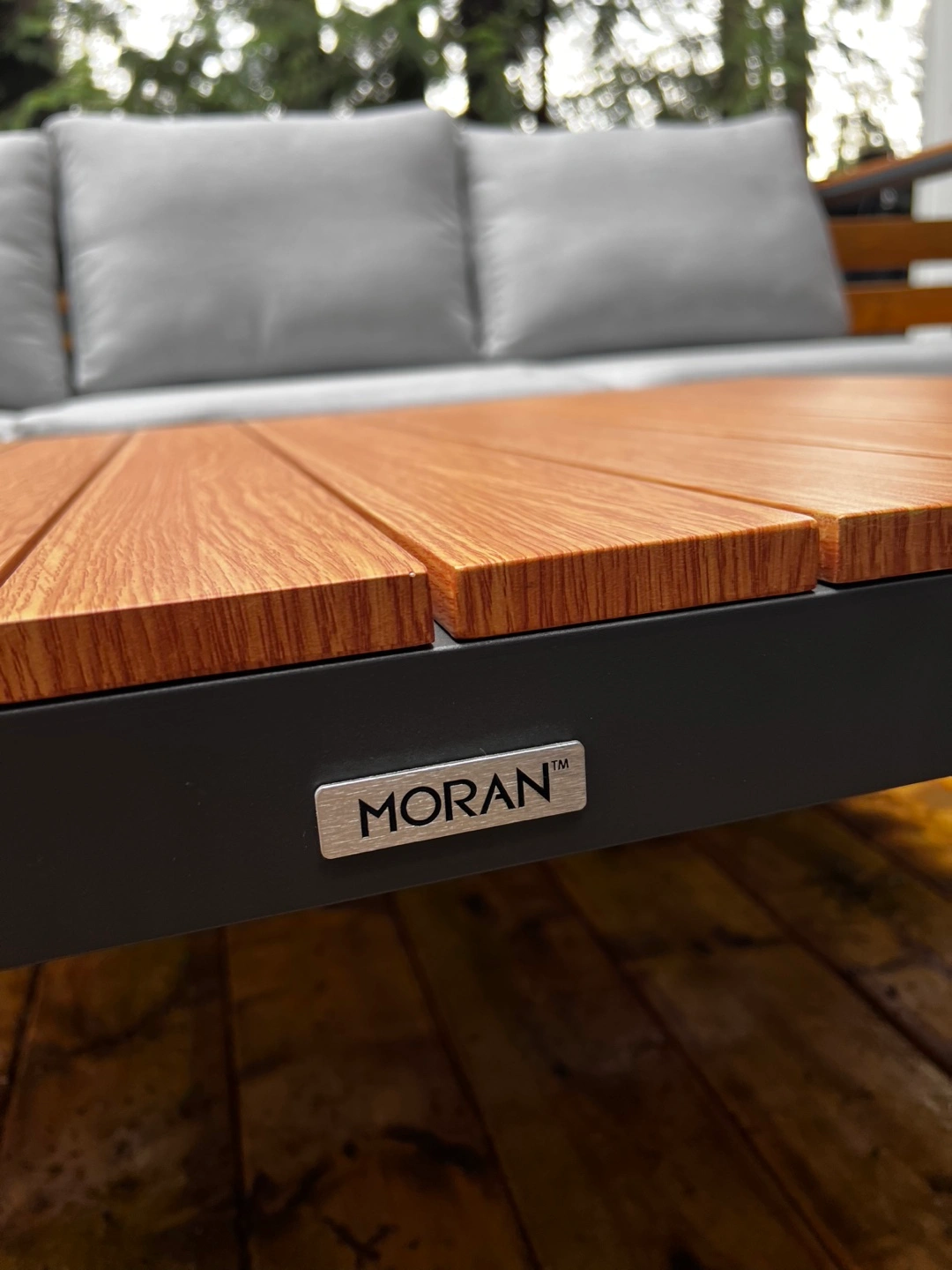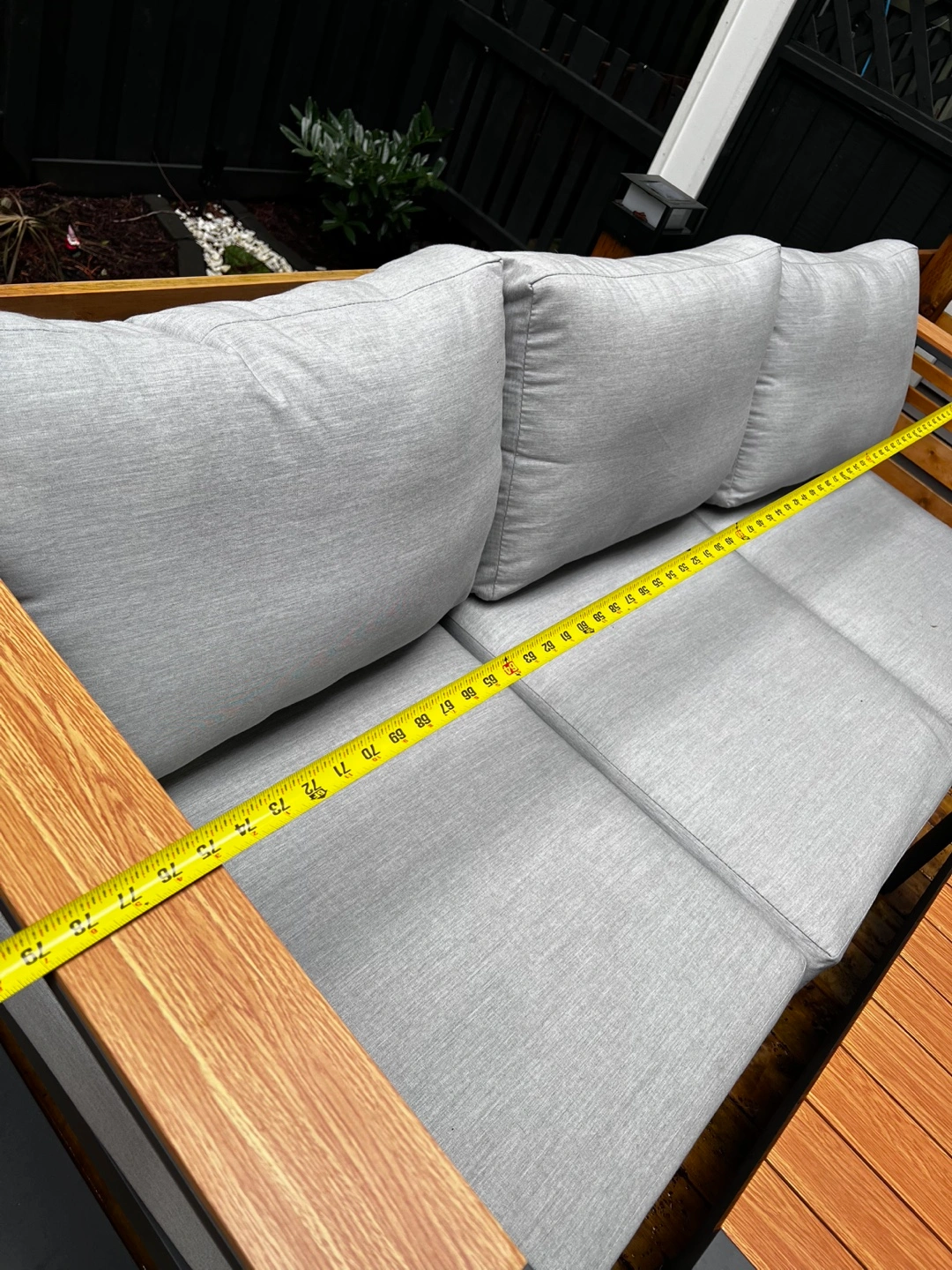 15Modern outdoor patio furniture set. Includes a three-seater sofa and coffee table. Aluminum frame with wood-look top and grey cushions. Excellent for entertaining. ( Delivery Available)