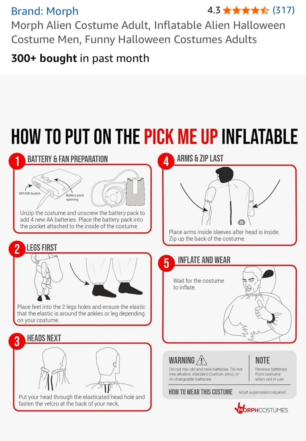 145Get ready for some laughs with this Morph Alien Inflatable Costume! Perfect for Halloween or any costume party. Designed for adults, this funny costume is sure to turn heads. It's designed to stay fully inflated, so you can enjoy up to 4 hours of battery life. The costume also features high-powered fans and elasticated seals to keep the costume inflated. Plus, there's an outside pocket for easy access to your phone, and your hands and face are free for comfort and convenience