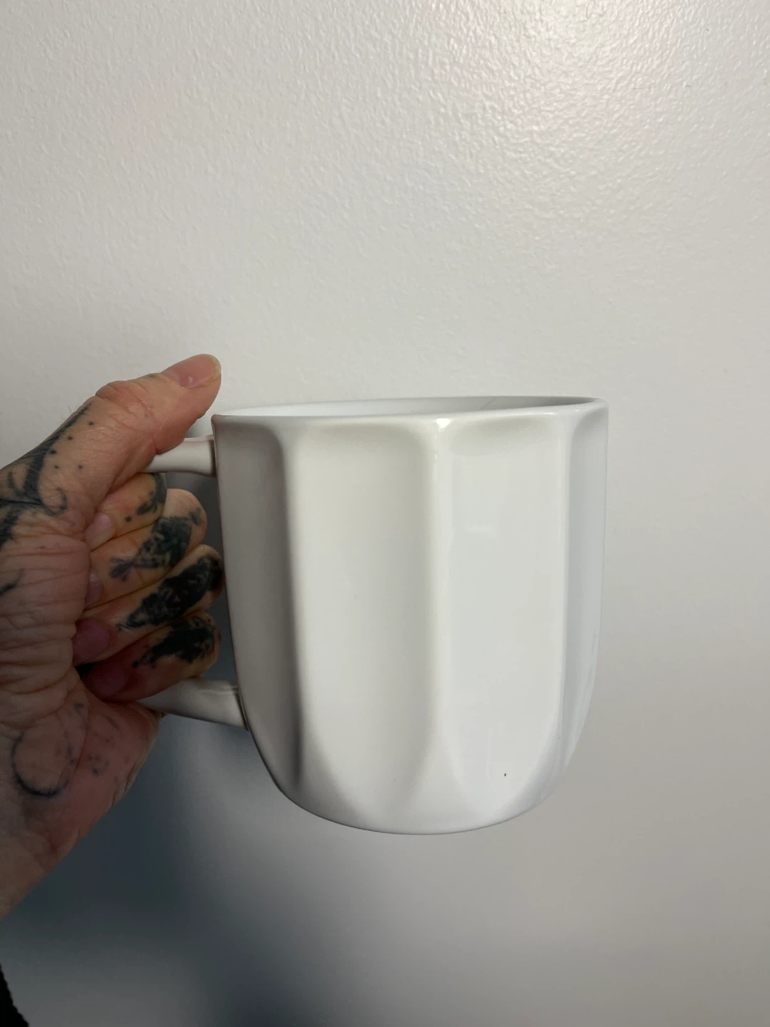 Two white ceramic mugs with a modern geometric design. They're great for your morning coffee or tea. The mugs are a nice size for a comforting beverage.