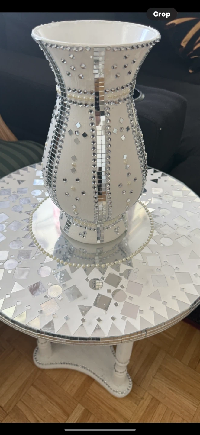 20Selling a lovely mosaic accent table that comes with a matching vase! The table features a mirrored mosaic design, adding a touch of sparkle to any room. The vase complements the table perfectly, creating a cohesive look. It's a great piece to add some unique flair to your home decor