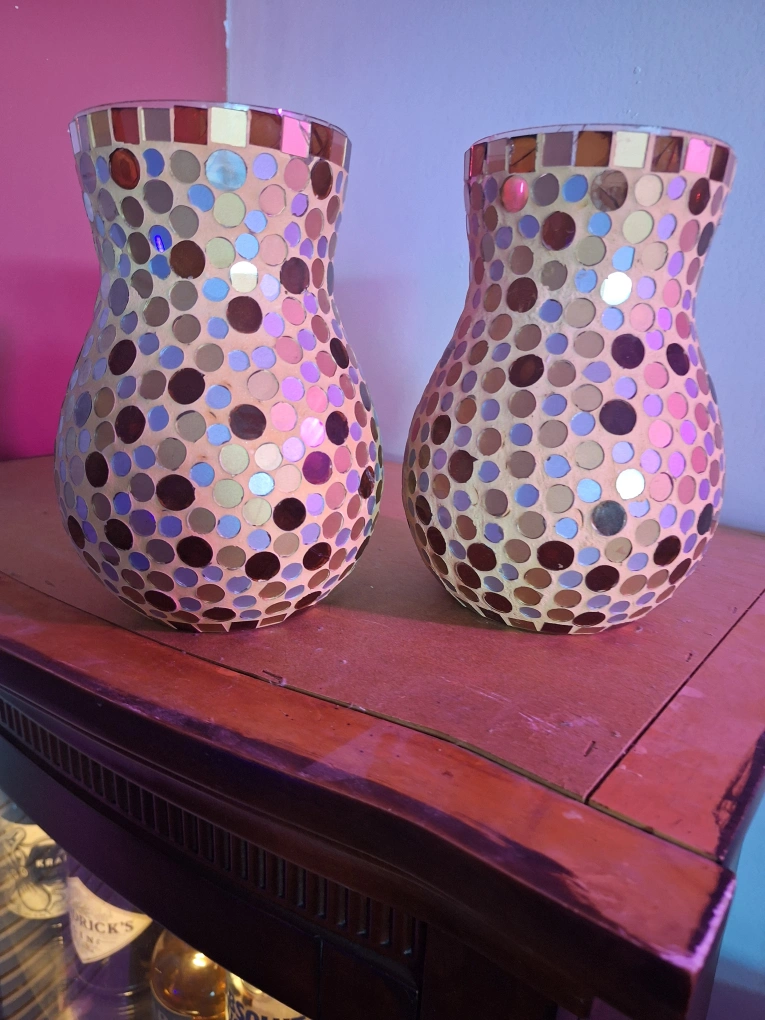 Selling a set of two mosaic glass vases. These vases feature a beautiful mosaic design with various shades of brown, beige, and iridescent accents. They add a touch of elegance and sparkle to any room!